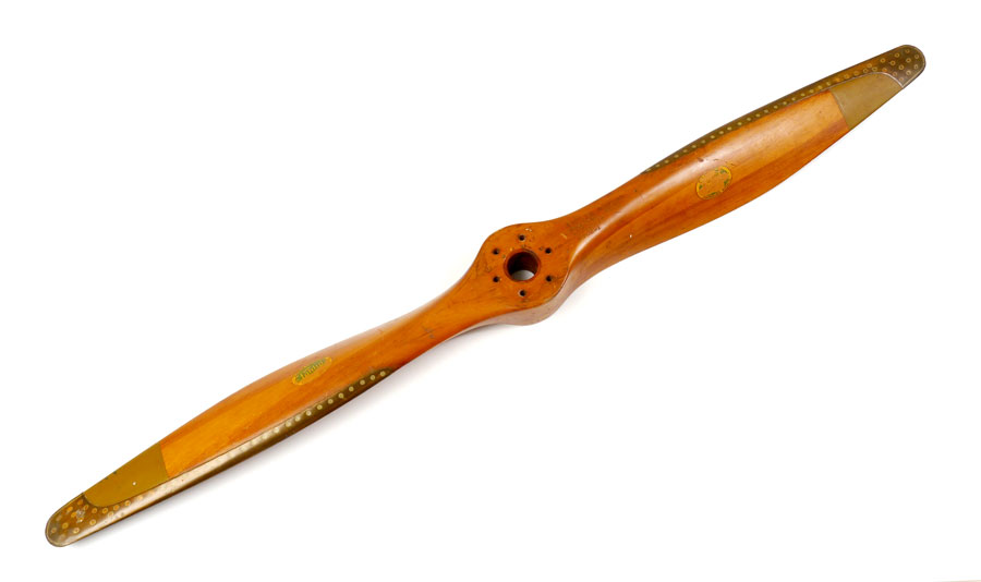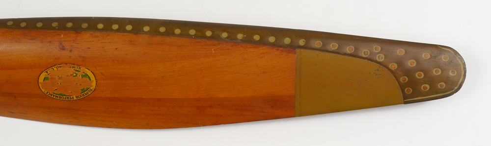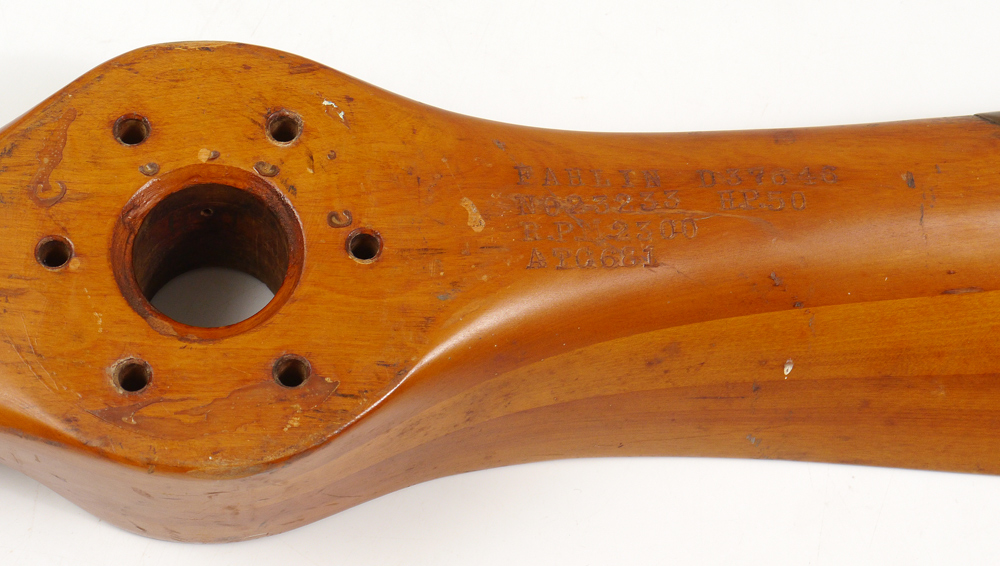 VINTAGE FAHLIN WOOD AIRPLANE PROPELLER: Partial original decals, impressed ''Fahlin, D37646, NO23233, H.P.50, R.P.M.2300, ATC 681. Overall 69 1/4'' long x 6 1/4'' x 3 1/4''.