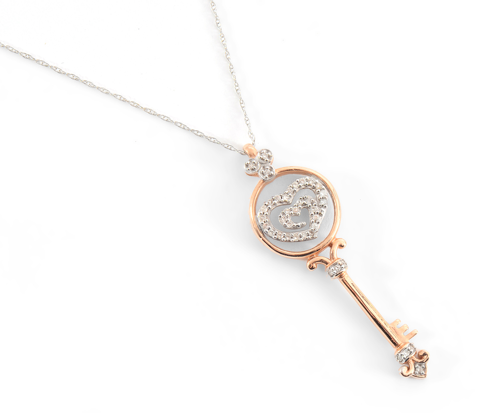DIAMOND KEY NECKLACE: Tiffany inspired 14K rose gold key shaped pendant set with diamonds totaling approx. .15 Ct. Rated VS in clarity and H-I in color. The diamonds are prong set. The fine link chain is also 14K gold. Weight: 3.8 grams. Length: 18''.