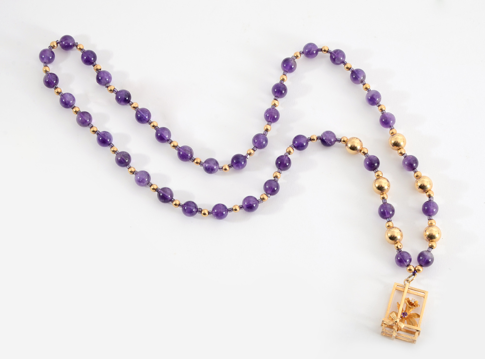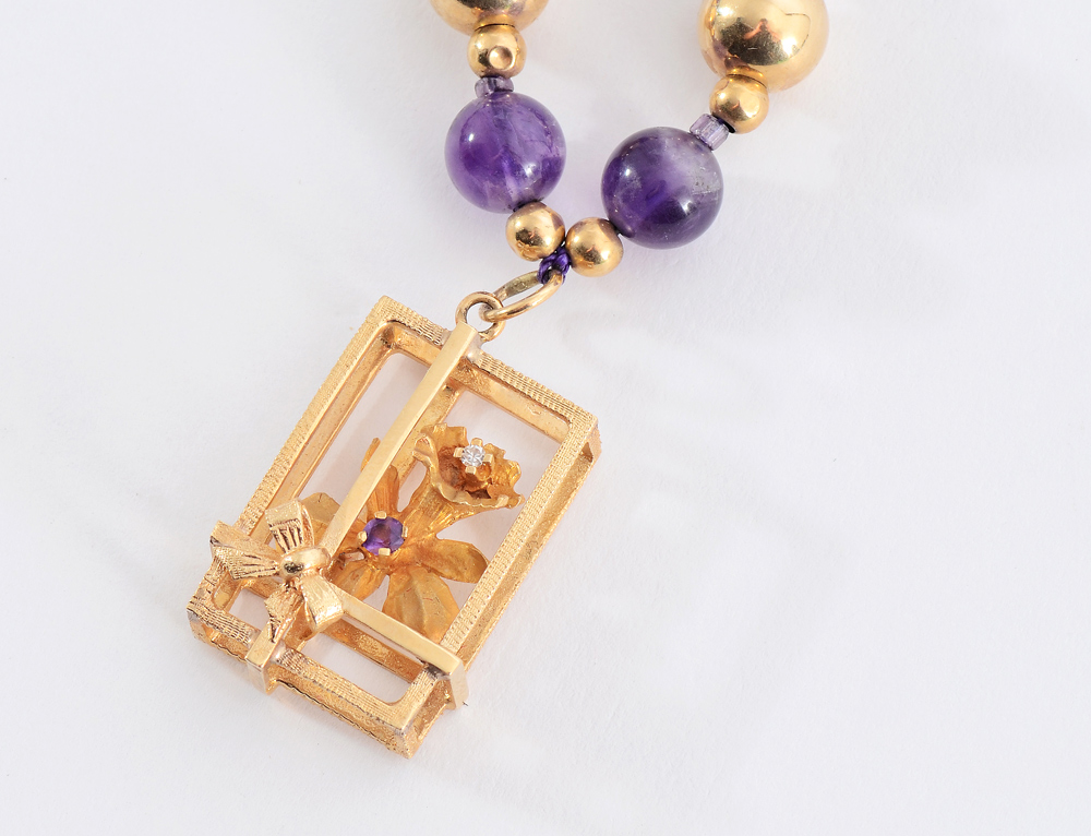AMETHYST & GOLD PENDANT NECKLACE: 14K yellow gold boxed ''gift wrapped'' orchid corsage pendant dangles from a continuous strand of 8 mm. amethyst beads and 14K yellow gold ball spacers and bugle beads, 4mm and 9mm. Length 24''. Gold weight approx. 9.5 grams.