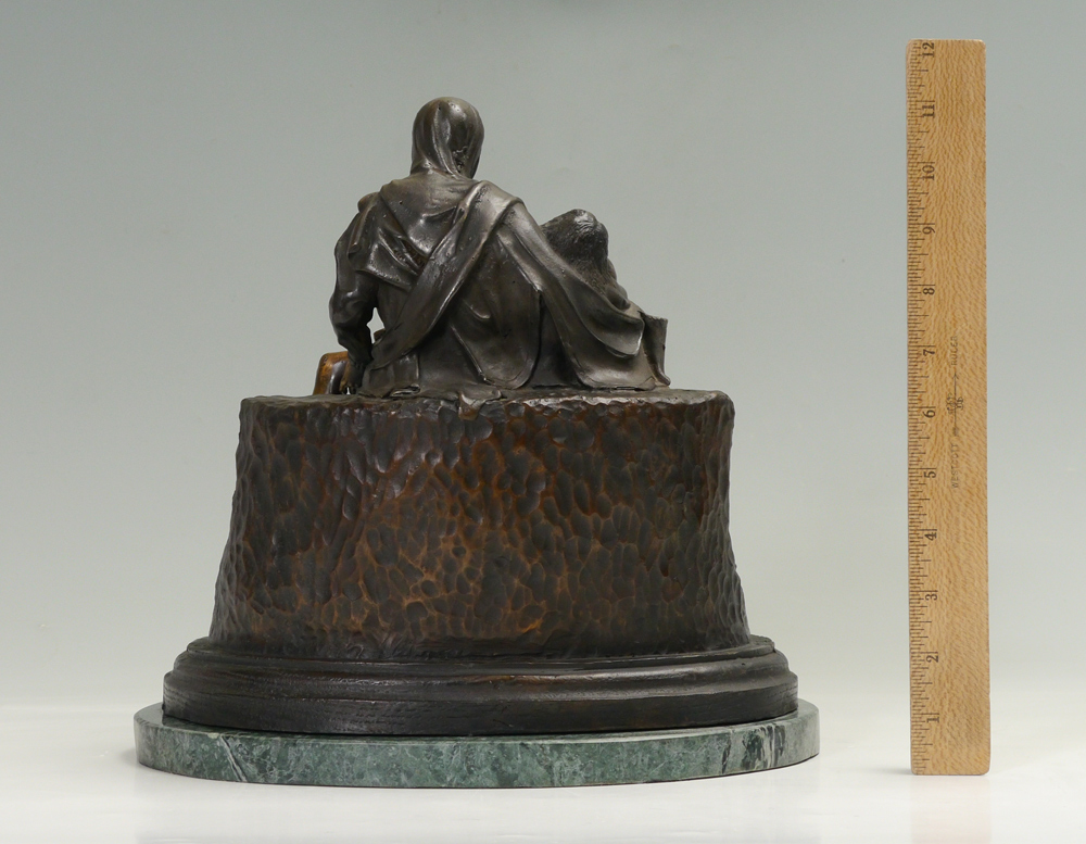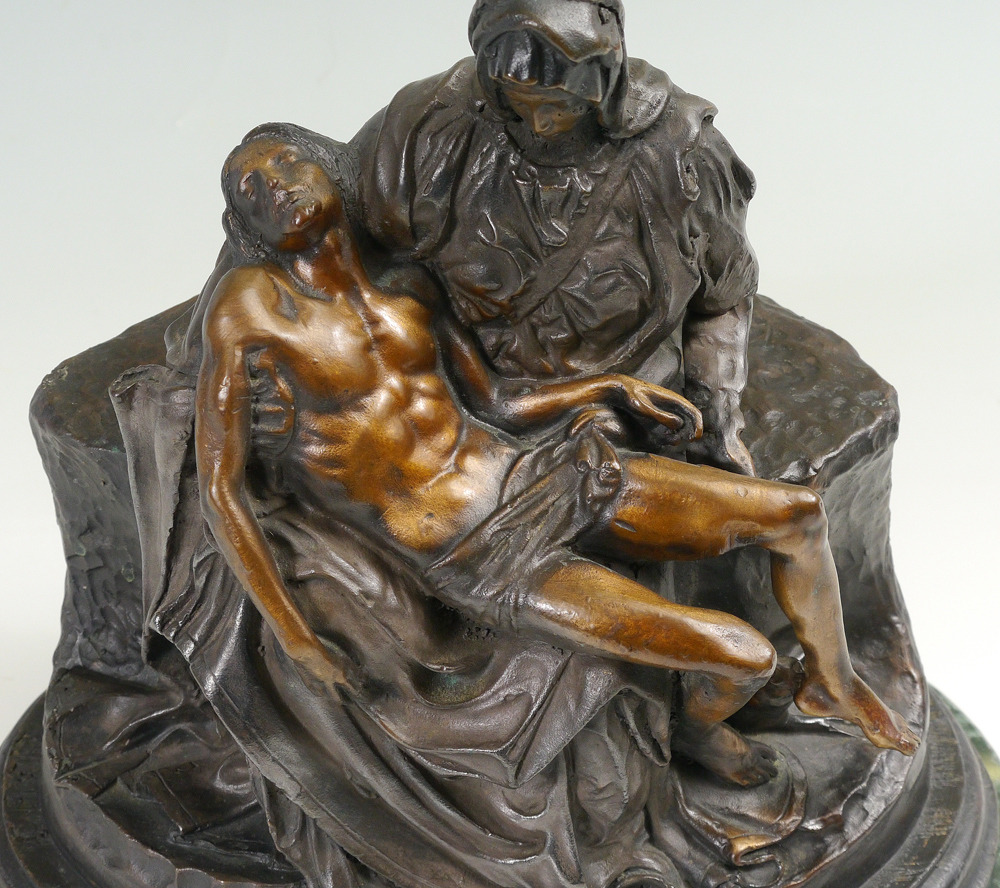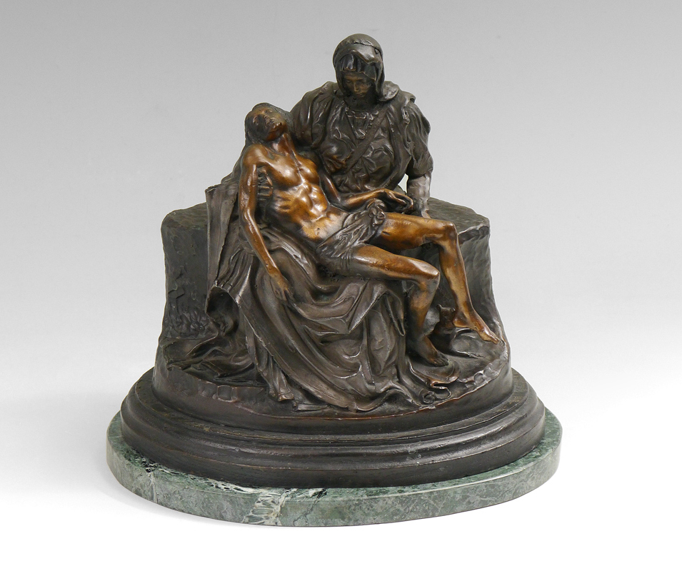 BRONZE GROUPING LA PIETA AFTER THE ANTIQUE: 12'' h. x 11'' w., affixed to a green marble plinth.