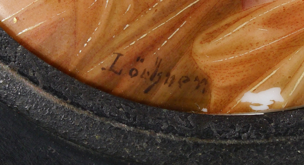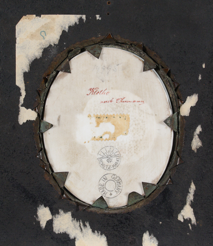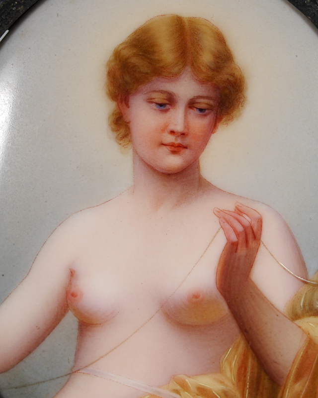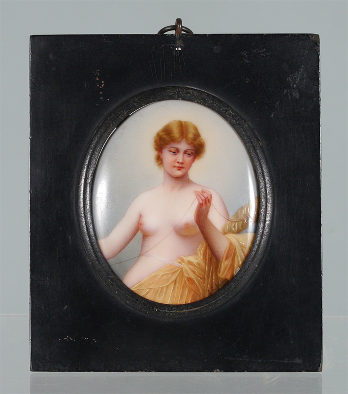 CLOTHO ''PORCELAIN PAINTING'': She is the Goddess of Sewing, After an Image created by Thumann, Depicting a Young Nude Maiden Goddess, Lorhnen?, marked verso with title and marker's mark Schutz-Marke, Made in Germany, Oval Sight size 3 1/2'' x 3'', encased in period ebonized frame 5 3/4'' x 4 3/4''.