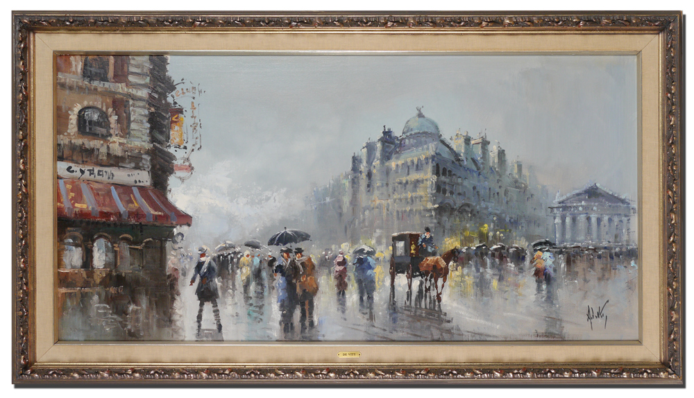 LARGE DEVITY PARISIAN PAINTING: Rainy day in Paris, Oil/Canvas, 24'' x 48'', signed lower right, stencil verso, framed, 31'' x 54 1/2''.