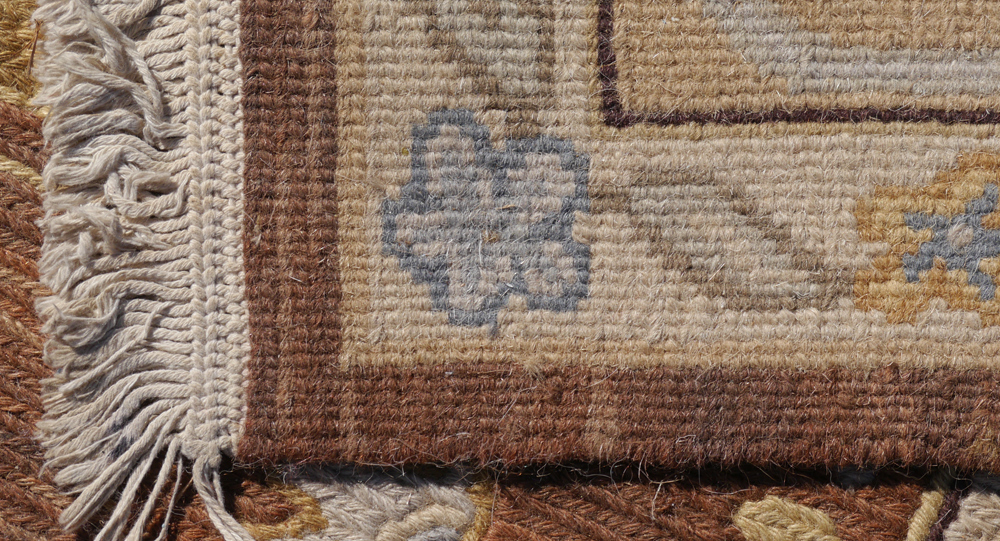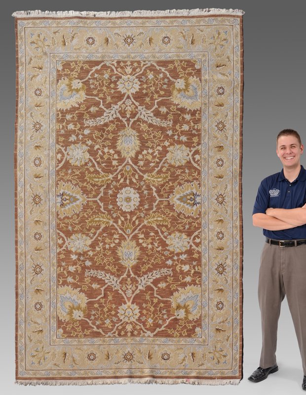 APPROX. 20-40 YR. OLD HAND WOVEN WOOL FLAT WEAVE RUG FROM INDIA, 6'1'' x 9': This rug has the look of a hand knotted pile rug in its design but it has been done in a flat weave using several different techniques to complete the rug including soumac, weft-wrapping , and chain-stitches. The colors are also unusual from the brown field as background to the pastel blues, yellows, and deeper green that make up the design motifs of the field and borders.
