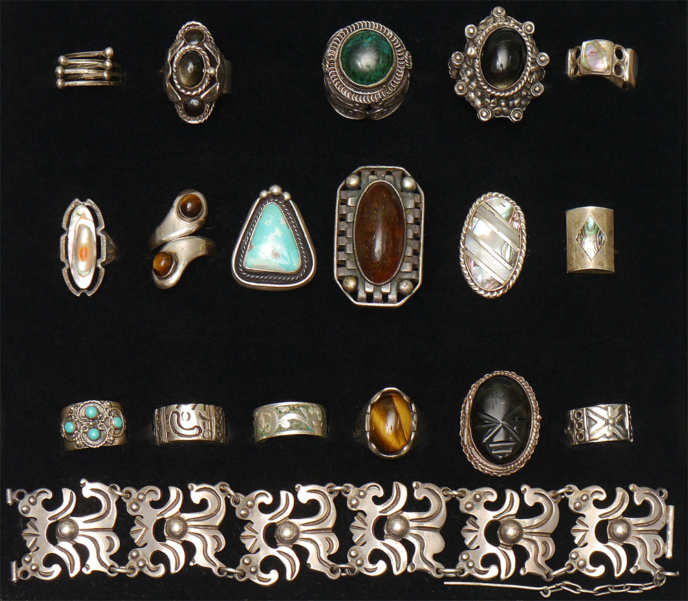 MEXICAN STERLING RINGS & BRACELET: 18 pieces total, 15 marked Made in Mexico / Taxco or with Eagle mark. Large green filigree ring unmarked, blister pearl only marked Sterling and triangular turquoise ring Handmade by J Tulley. Sold as a lot with display box.