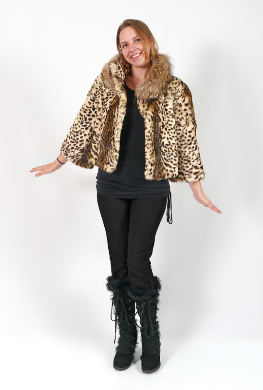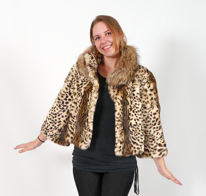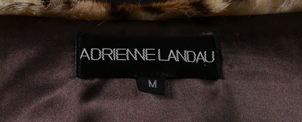 ADRIENNE LANDAU LEOPARD PRINT RABBIT FUR JACKET: With raccoon collar. Off set button, slit pockets. Size Medium, measures approx. 20'' collar to hem, 18'' sleeve, 18'' shoulder to shoulder.