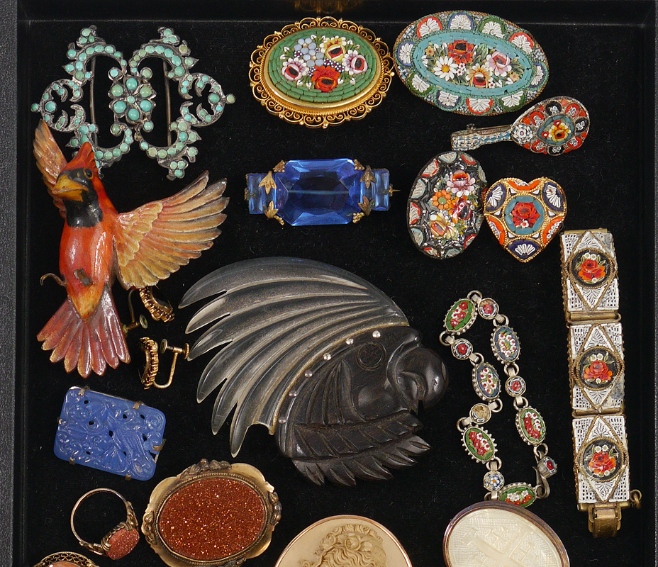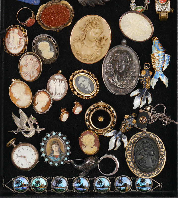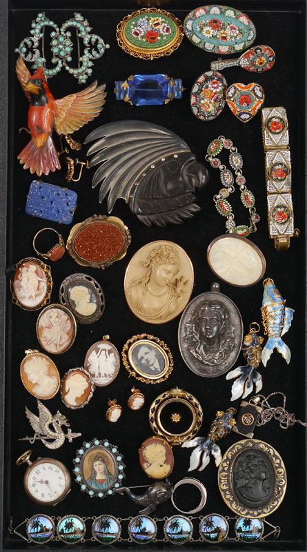 TREMENDOUS ESTATE FRESH VINTAGE GROUP INCLUDES CAMEOS: Approx. 40 pieces, at the center is a 2.5'' 14K gold framed carved lava cameo pendant brooch. An additional 8 cameos, Victorian mourning portrait pins, 7 Italian micro mosaic pins and bracelets, a 3'' carved cardinal pin, ladies pocket watch, 3 reticulated fish, gold stone brooch and ring, a large Lucite and wood cockatoo pin, butterfly bracelet, garnet heart earrings, and a miniature Madonna portrait pendant brooch.