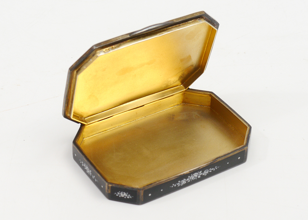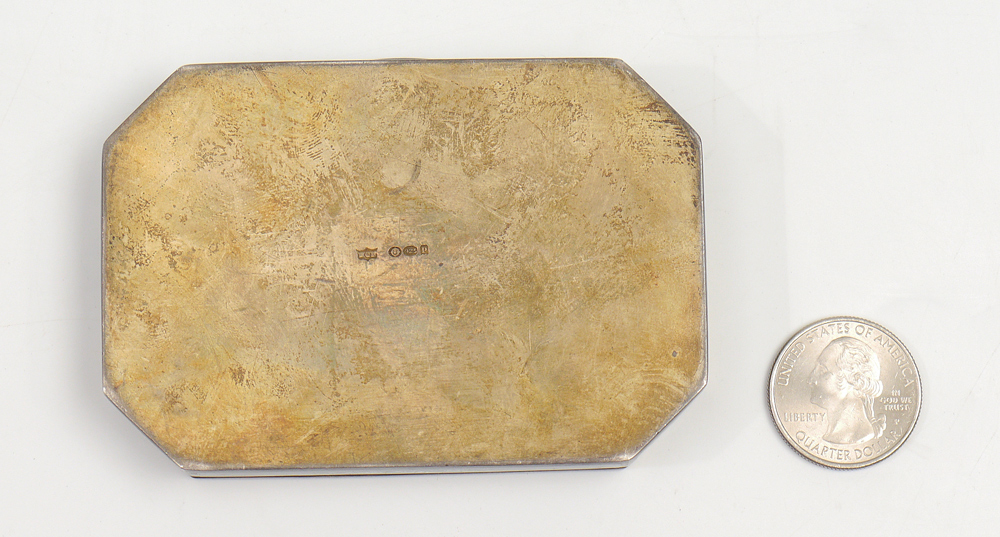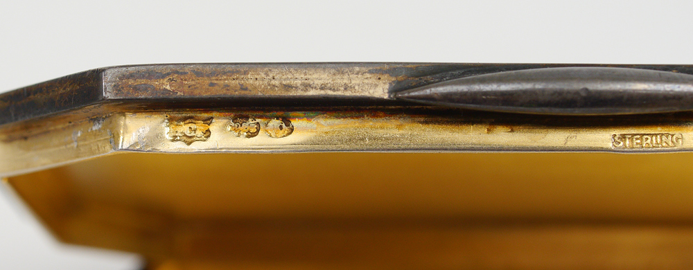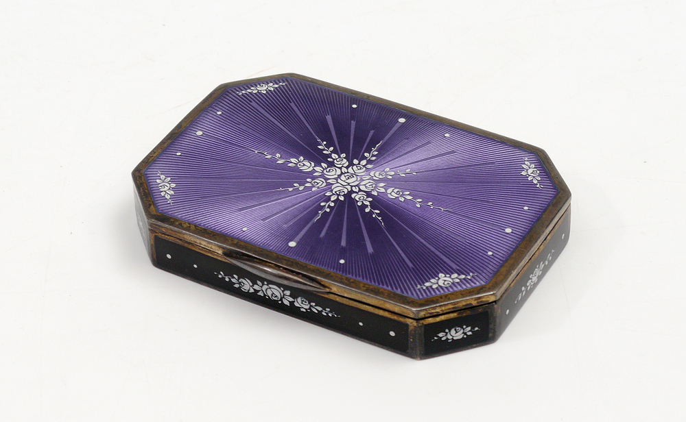 CONTINENTAL STERLING GUILLOCHE COMPACT: Purple guilloches with applied white floral enamel decoration, vermeil interior. Marked on base with unknown maker / importers hallmarks and London import hallmarks. 3 5/8'' x 2 5/8'' x 1/2'', overall 5.3 troy oz inclusive.
