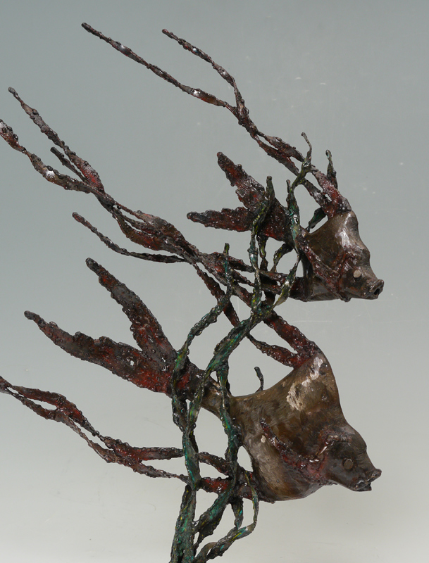 BUCHA, Mike, (American, 20th C): Bronze sculpture of Angel Fish swimming through the reeds, overall approx. 20''h. x 13'', signed on bronze base, mounted on a wooden plinth 4'' x 3''.