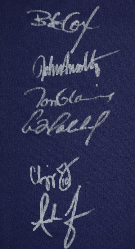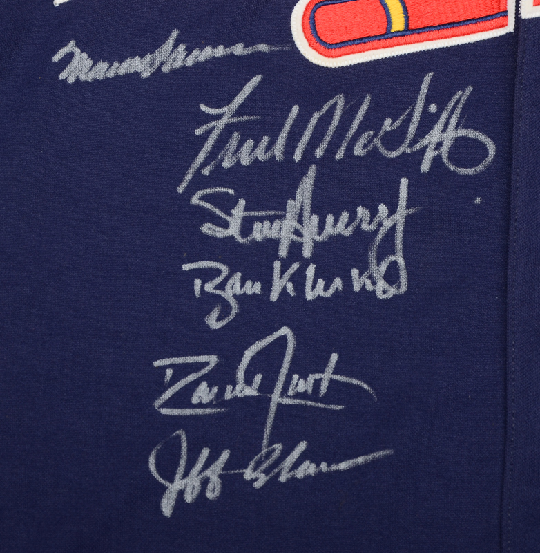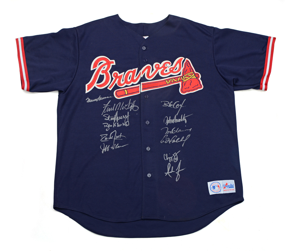 ATLANTA BRAVES 1995 WORLD SERIES AUTOGRAPHED JERSEY: Signatures in silver marker to include Fred McGriff, Steve Avery, Bobby Cox, John Smoltz, Tom Glavin, Chipper Jones, Jeff Blauser, Ryan Klesko, David Justice. Size XL, all signatures on front, no COA available.