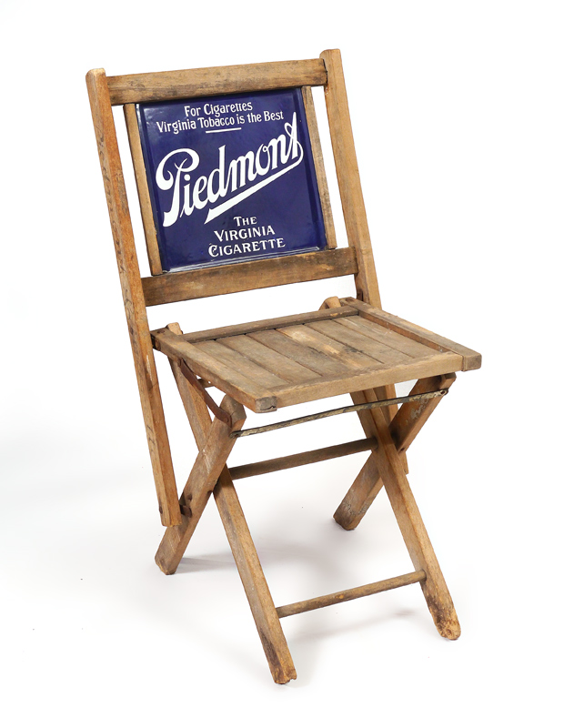 PIEDMONT CIGARETTE ADVERTISING FOLDING CHAIR: Back with double sided enamel advertisement for Piedmont Cigarettes, sides of back with partial stamping. Open measures 31 1/2'' h. x 20'' x 16 1/4''.