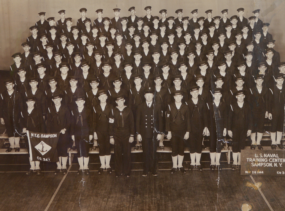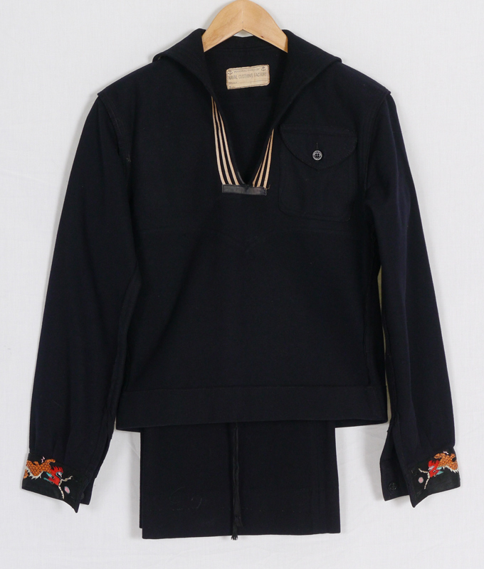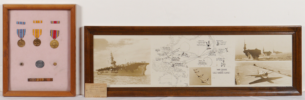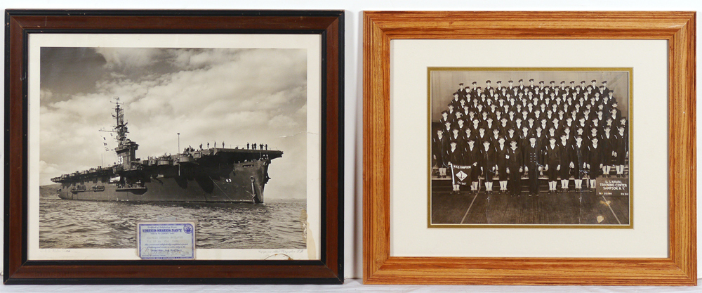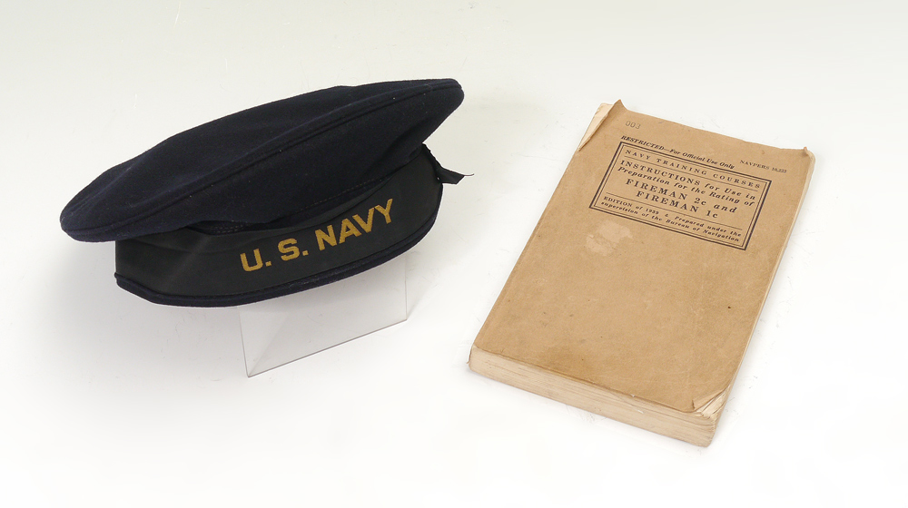 NAVAL COLLECTION TO INCLUDE UNIFORM, PHOTOGRAPHS & MEDALS: WWII US naval firefighter uniform to include blue jumper with embroidered dragons at sleeve ends, hat and pants. Also included are 2 framed photographs of the USS Maklin Island, photo of the owners class, framed medals and firefighter book.