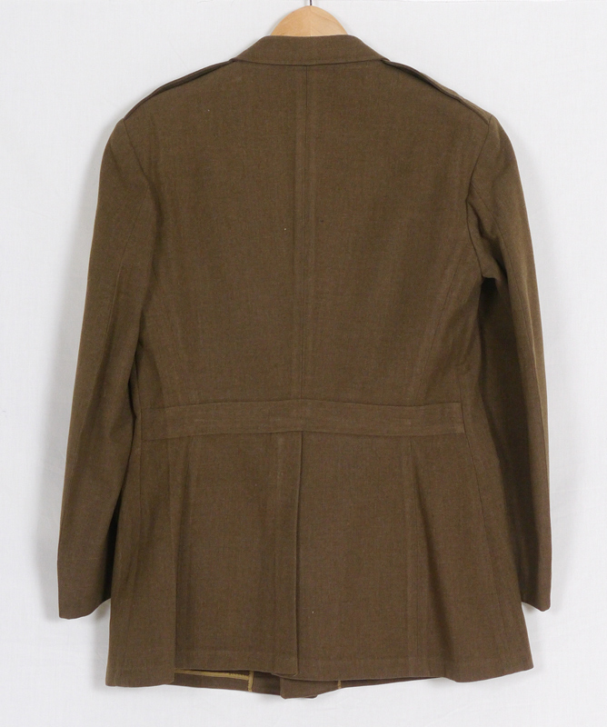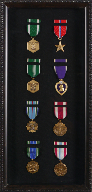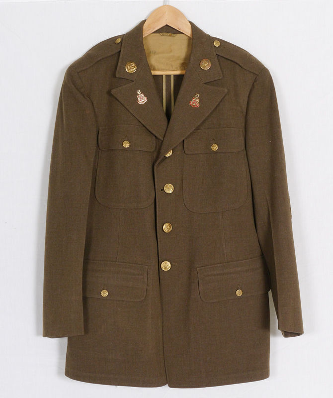 WWII ARMY TRANSPORTATION CORPS LONG COAT & FRAME OF MEDALS: 40R coat with no rank designation, transportation corps lapel pin. Sold with a shadowbox frame of 8 WWII medals, 21 1/2'' h. x 10 1/2'' x 2''.