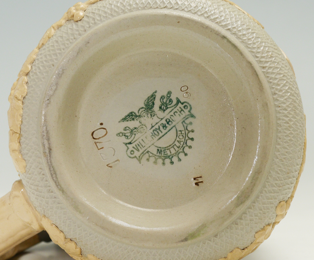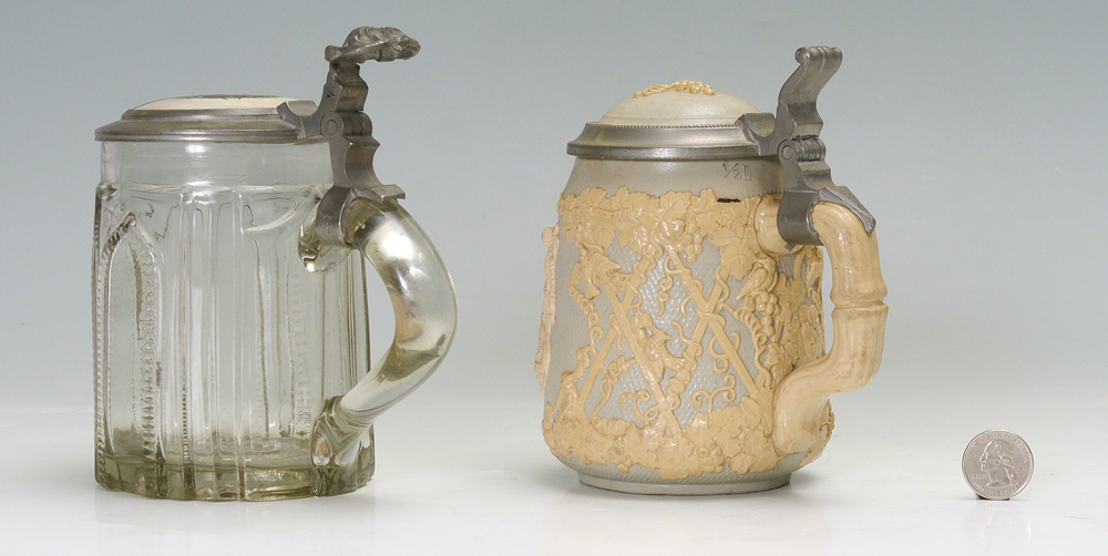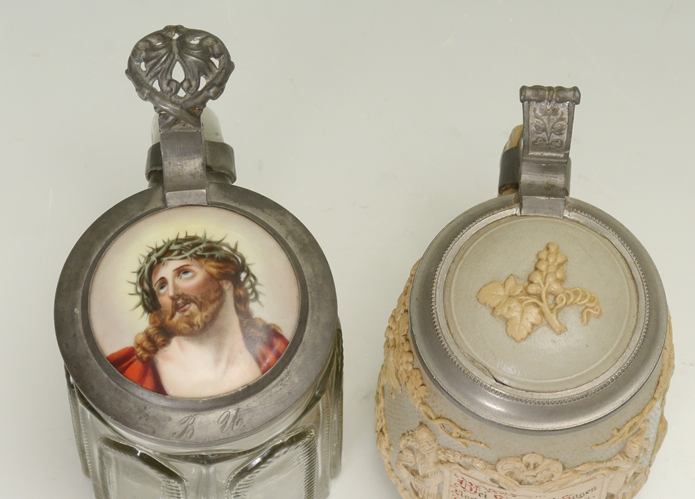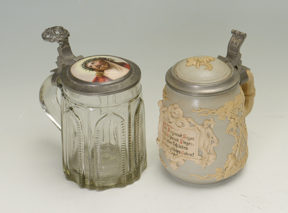METTLACH RELIEF STEIN 1370 & GLASS STEIN: 2 pieces to include 1) 1/2 liter Mettlach relief stein #1370 featuring grape vines, figures and plaque. 6'' h. x 5 1/4''. 2) 1/2 liter glass stein, hinged lid with inset porcelain plaque of Jesus, no visible markings, monogrammed BU. 6 1/4'' x 6''.