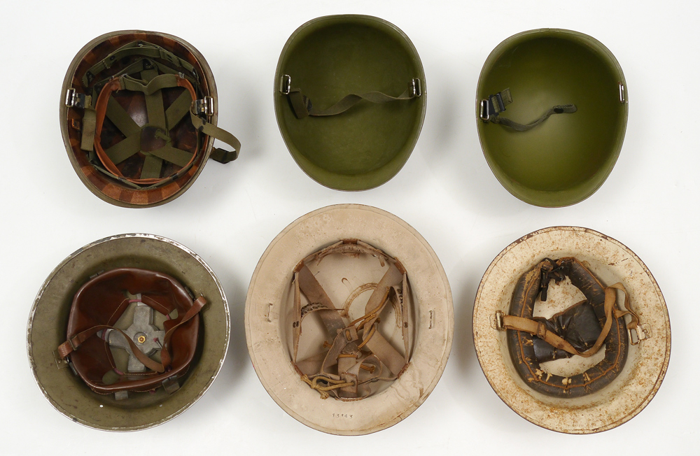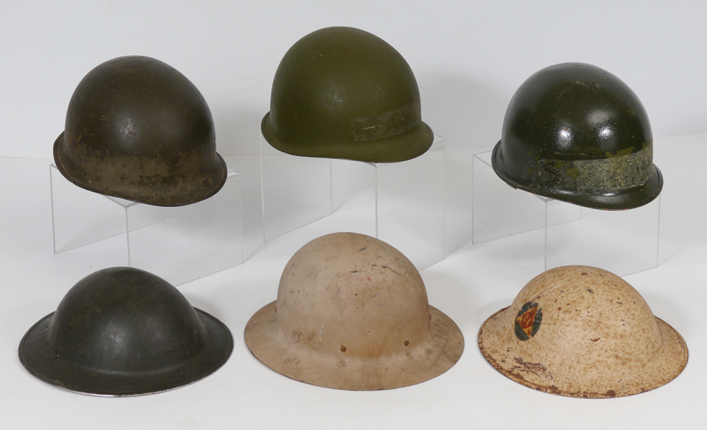 COLLECTION OF 6 US MILITARY HELMETS: 6 assorted helmets from WWI doughboy to WWII standard issue, one with original liner. One fixed bale, the balance hinged.