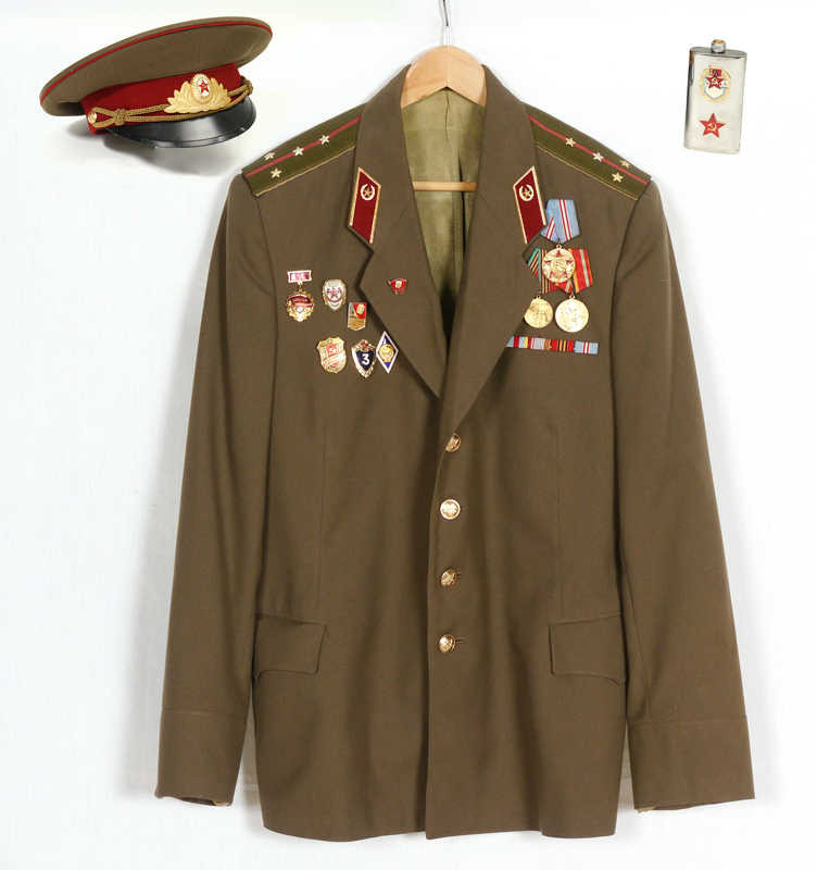 RUSSIAN ARMY QUARTERMASTERS UNIFORM: To include jacket with original insignias and decoration, no size label evident; hat with original hat badge and cord.