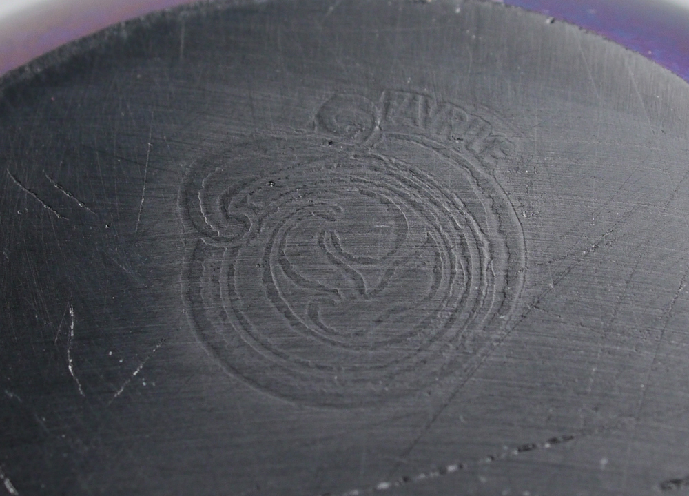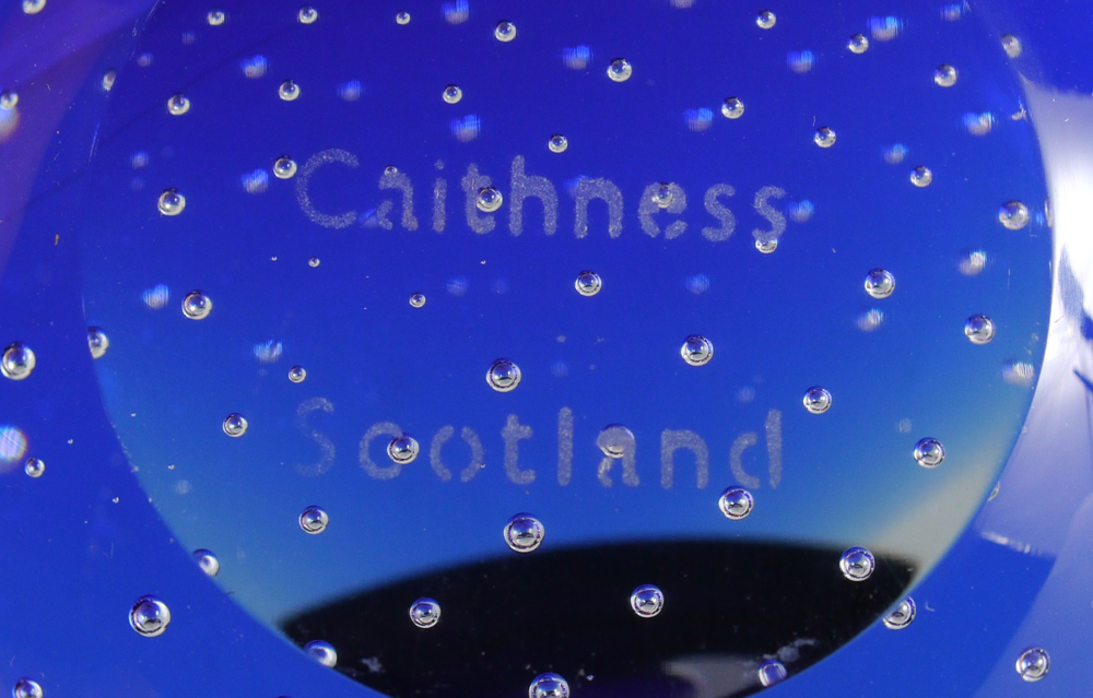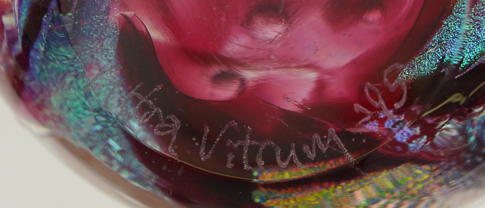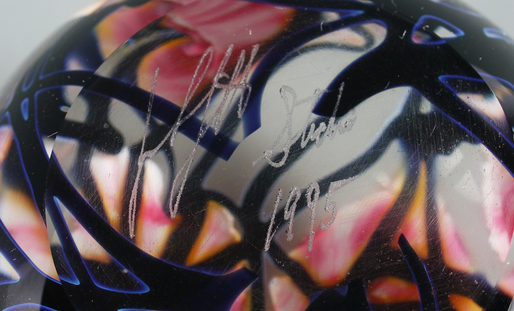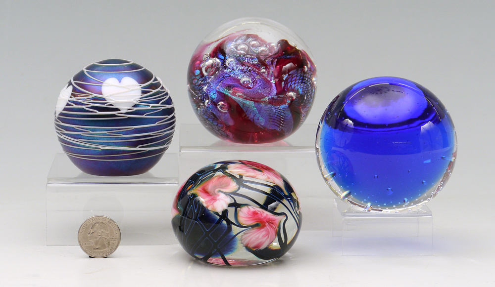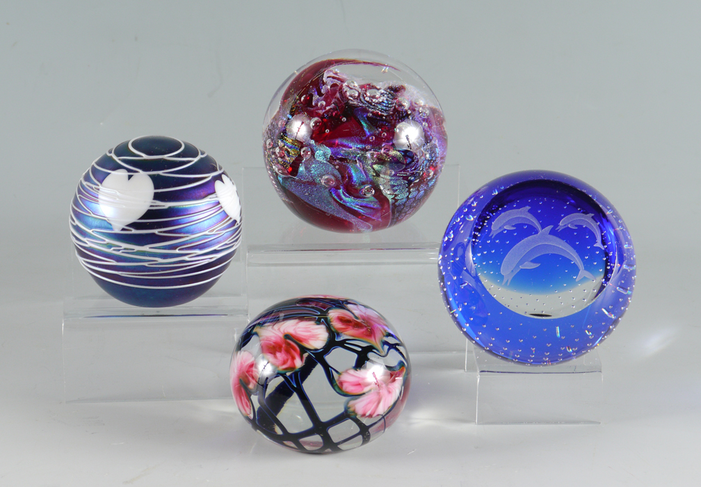 COLLECTION OF 4 ART GLASS PAPERWEIGHTS: An assembled collection of 4 paperweights to include 1) Caithness blue and clear glass control bubble with etched dolphins, 3'' dia. 2) Clear glass with control bubble and iridescent freeform interior, signed Attra Vitrum '95, 3 1/8'' dia. 3) Illegible studio signed with hearts and vines motif, 2 7/8'' dia. 4) Iridescent blue with applied threaded hearts and vines motif, spurious Favrile mark on base, 2 3/4''.