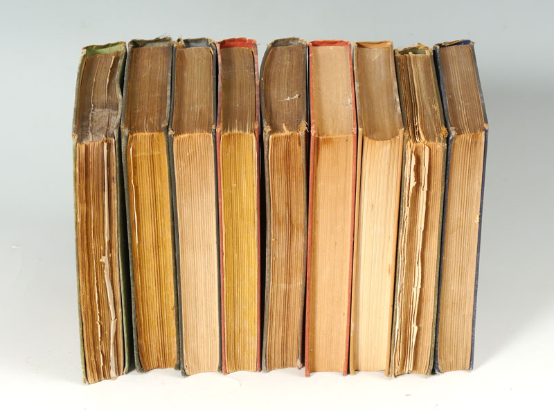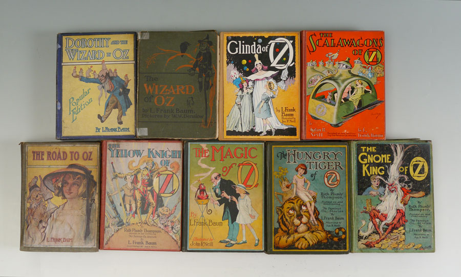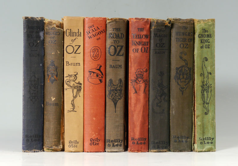 COLLECTION OF 9 WIZARD OF OZ BOOKS: 9 books in the Wizard of Oz Series to include 1) ''The Wizard of Oz'', missing title page with date, L. Frank Baum. 2) ''Glinda of Oz'', copyright 1920, Baum. 3) ''Dorothy and the Wizard of Oz'', Popular edition, copyright 1908, Baum. 4) ''The Road to Oz'', copyright 1909, Baum. 5) ''The Magic of Oz'', copyright 1919, Baum. 6) ''The Yellow Knight of Oz'', 1930, Ruth Plumly Thompson. 7) ''The Hungry Tiger of Oz'', 1926, Thompson. 8) ''The Gnome King of Oz'', 1927, Thompson. 9) ''The Scalawagons of Oz'', 1941, John R. Neill.