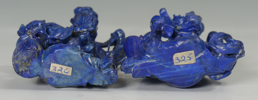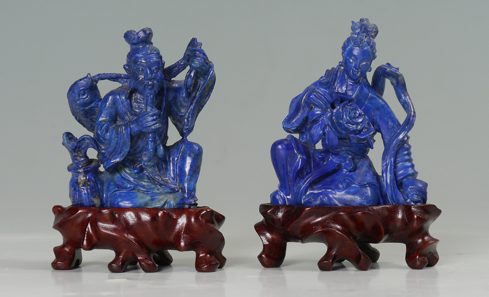 2 PIECE CHINESE CARVED SODALITE FIGURES: 2 figures to include 1) Fisherman with catch and pipe, 2 7/8'' h. x 2 1/4'', carved fitted wood base. 2) Figure of a seated woman with large blossom, 2 3/4'' h. x 2 3/4'', carved fitted wood base.