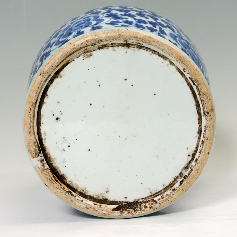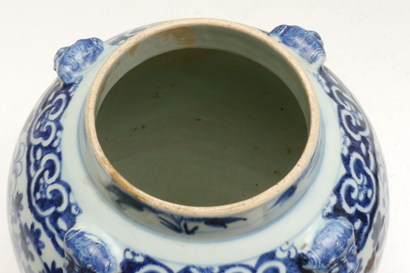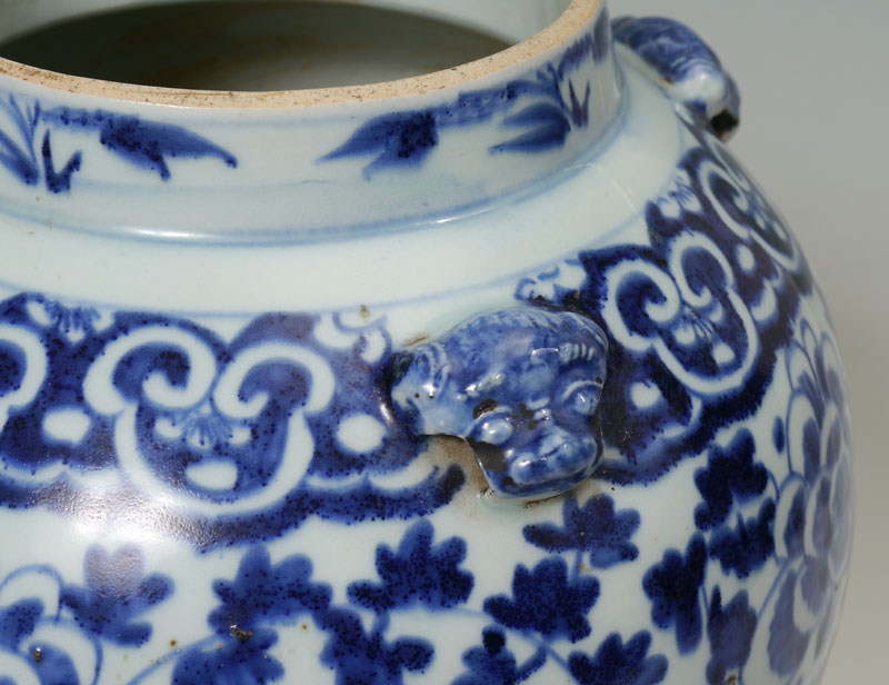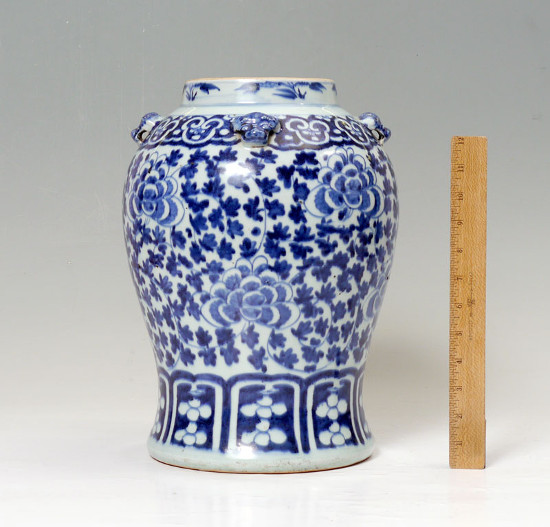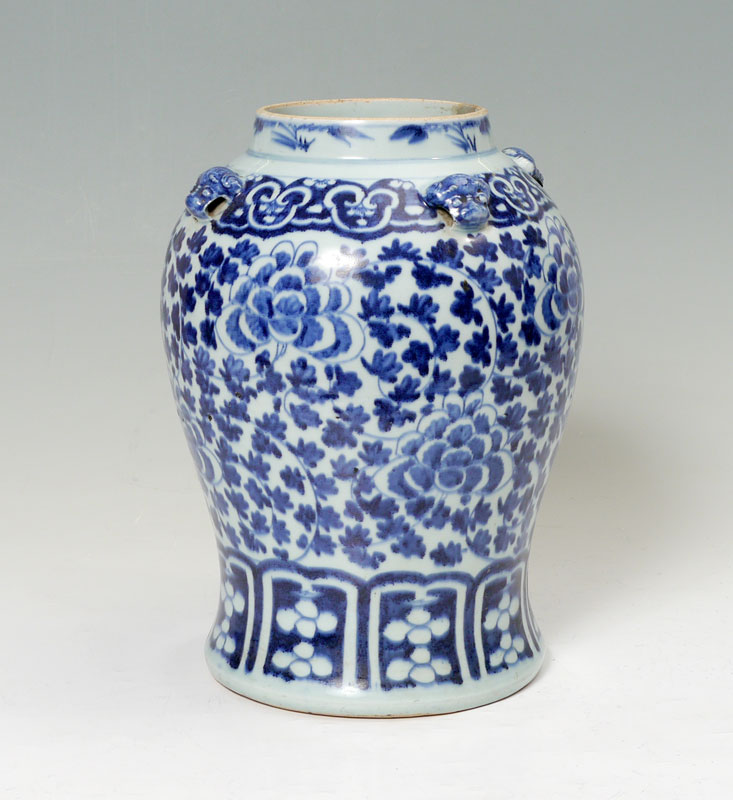 CHINESE BLUE AND WHITE DECORATED JAR: Floral decoration all over, applied figural dog head handles. 14 1/2'' h. x 10'' dia.