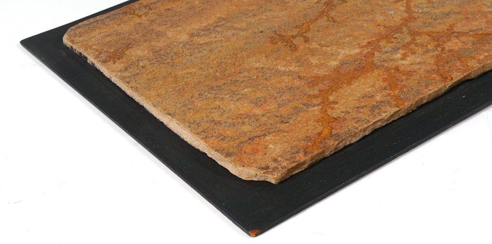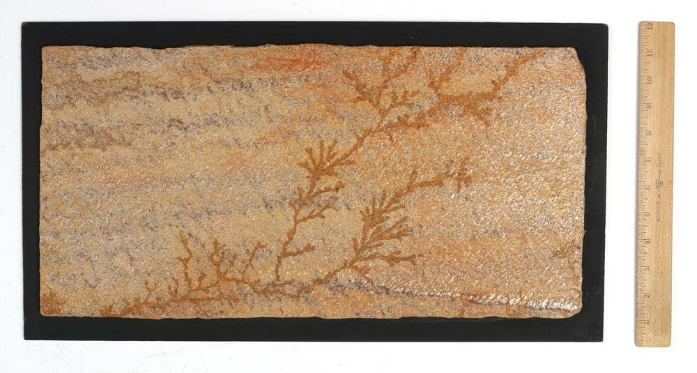 FERN FOSSIL WALL PANEL: Prehistoric fossilized fern in sandstone, 10'' X 20'', mounted to wood board 21 1/2'' x 11 3/4''.