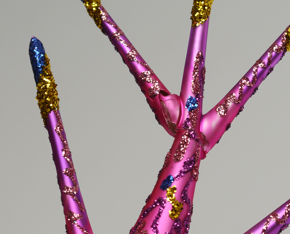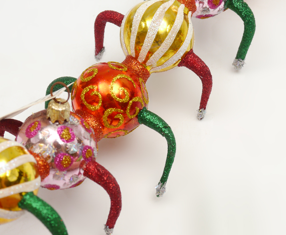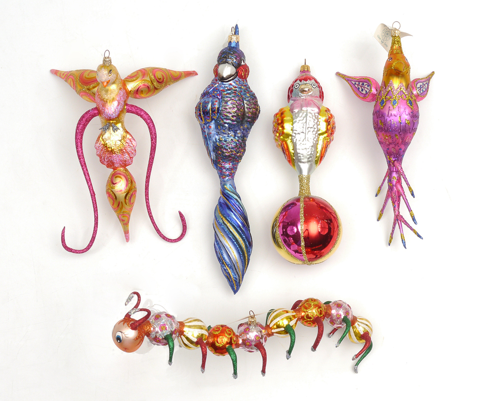 ESTATE LOT OF LARRY FRAGA DESIGNS HAND BLOWN CHRISTMAS ORNAMENTS: 5 pieces to include, ''Blue Hazel''; ''Behulah'' with repair to one leg and ''Pink Pearl'' with repair to tail but too cute to leave behind; ''Yellow Swirl''; and one, whose name I didn't find, a bird with glasses? over a ball.