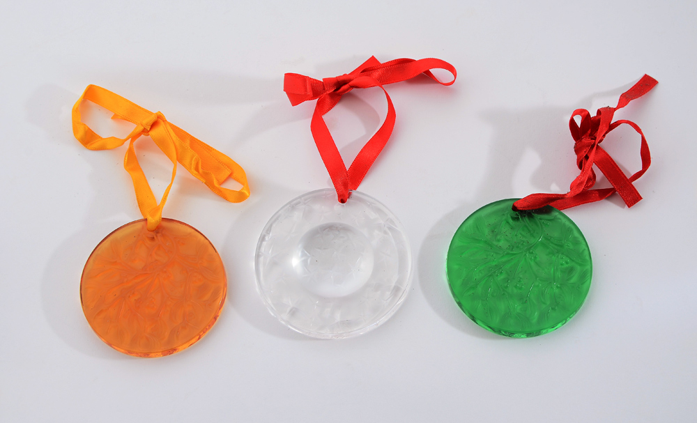 LALIQUE CRYSTAL CHRISTMAS ORNAMENTS: 1990 Green and 1991 Gold Mistletoe pattern, 2 5/8''dia. each and 1994 Clear Star pattern, 2 7/8''dia. All signed Lalique R France, all with original gift box, one box with bad foam.