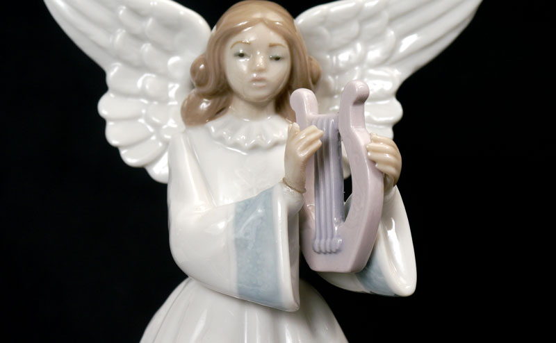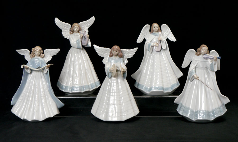 LLADRO PORCELAIN ANGEL TREE TOPPER FIGURINES: 5 angel Christmas tree toppers by sculptor Francisco Catala. 1990 Blue #5719, 7''; 1991 ''Heavenly Harpist'' #5830, 7.25'', reattached right hand still missing a few finger tips; 1992 ''Angelic Cymbalist'' #5876, 7''; 1993 Angelic Melody #5963, 7.25''; and 1994 ''Angelic Violinist'' #6126, 7''.