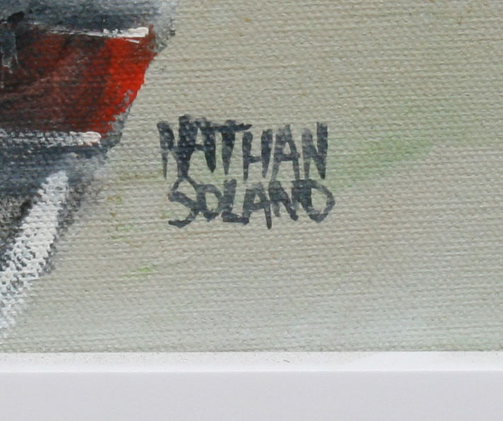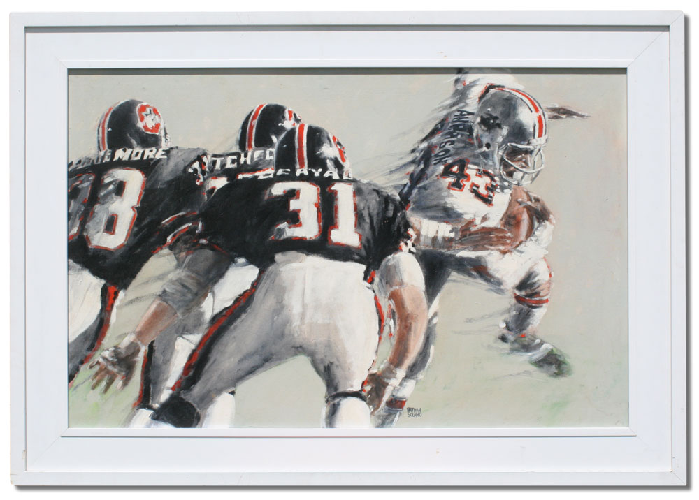 SOLANO, Nathan, (American, 20th C.): Former Houston Gamblers, Tampa Bay Bandits, and NFL San Diego Chargers Star Running Back Gary Anderson, Oil/C, 26'' x 40'', signed lower right and framed, 33 x 40''. Solano is a now famous western scene painter that started his career primarily as an illustrator.
