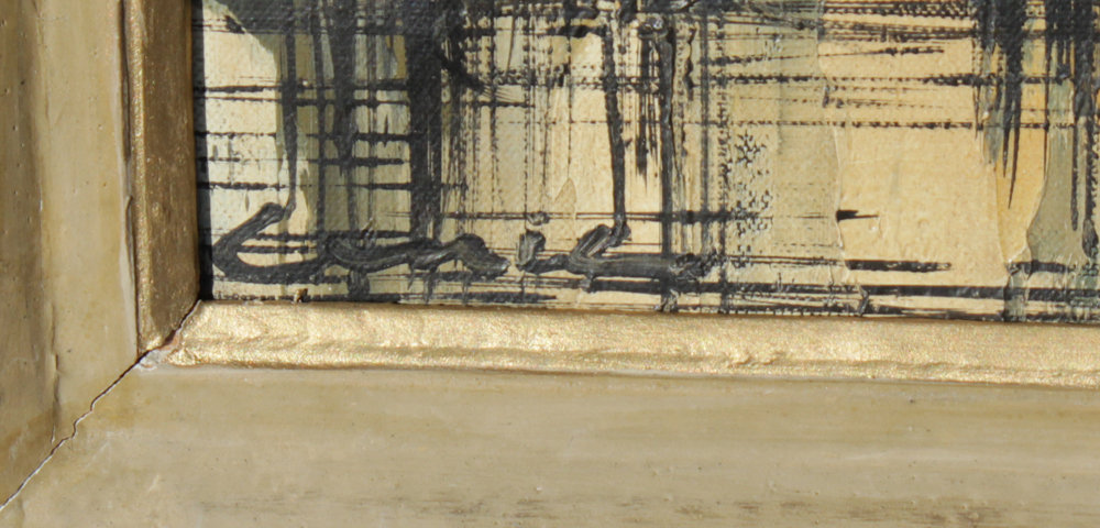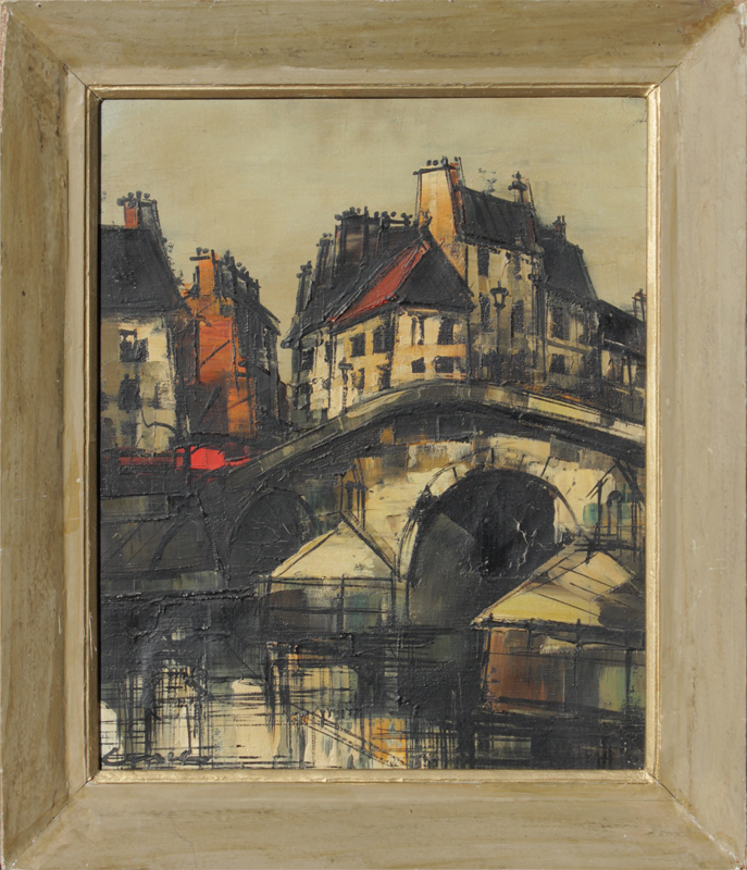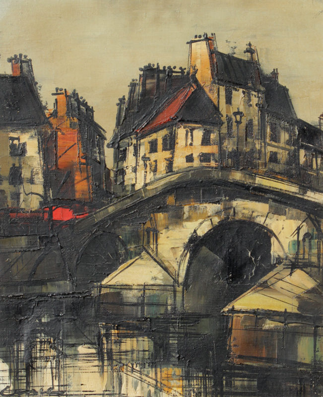 ILLEGIBLY SIGNED BUFFET STYLE EUROPEAN CANAL PAINTING: Oil/Canvas, 18'' x 15'', signed lower left, framed 22 1/2'' x 20''.