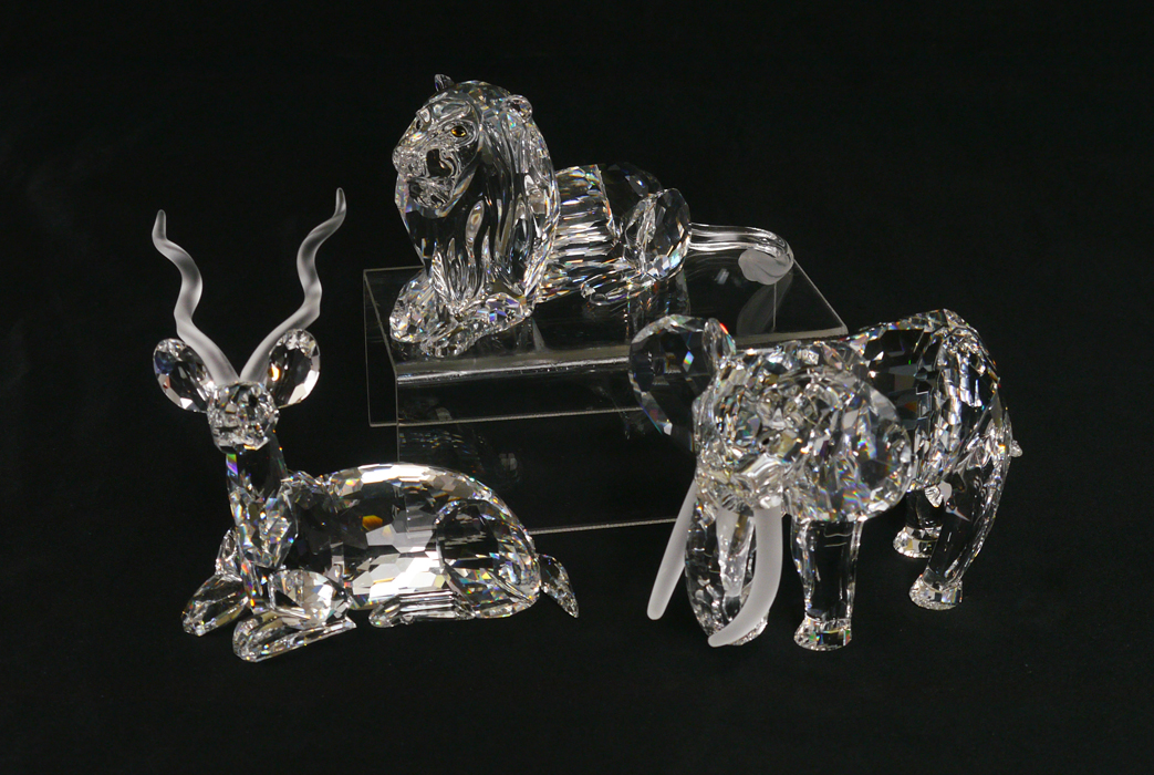 SWAROVSKI CRYSTAL FIGURES ''INSPIRATION AFRICA'': 1) 1993 ELEPHANT #DO1X931, Martin Zendron designer, retired 1993. 2) 1994 KUDU #DO1X941, Michael Stamey designer, retired 1994. 3) LION #DO1X951, Adi Stocker designer, retired 1995.