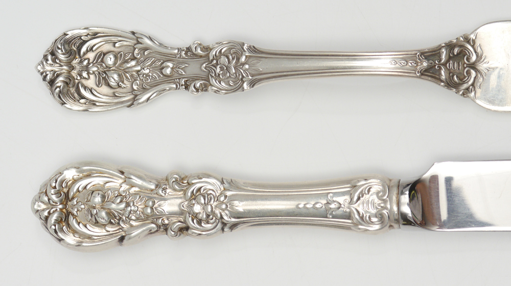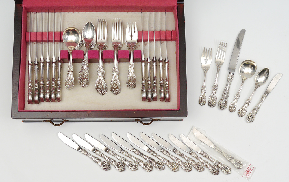 REED & BARTON FRANCIS I STERLING FLATWARE SERVICE: Complete service for 12, approx. 72 pieces in the Francis I pattern by Reed & Barton to include 12 forks (7 1/4''), 12 salad forks (6''), 12 teaspoons (5 7/8''), 12 soup spoons (5 7/8''), 12 hollow knives (9 1/8''), 12 hollow butter knives (6 3/8''). Sold with a wood silver chest, 5 1/2'' h. x 16 1/2'' x 11 1/2''. Approx. 78.6 troy oz.