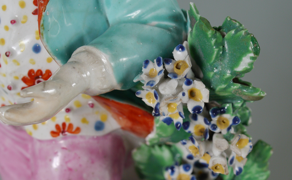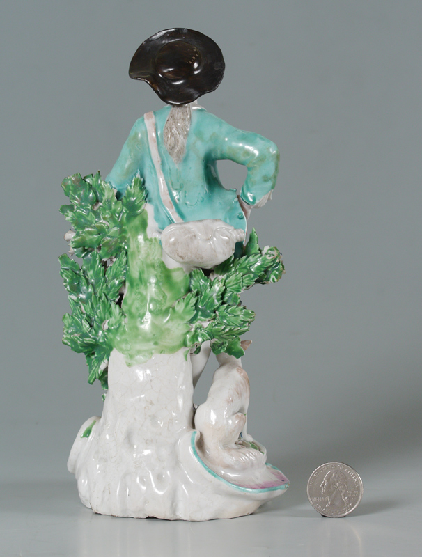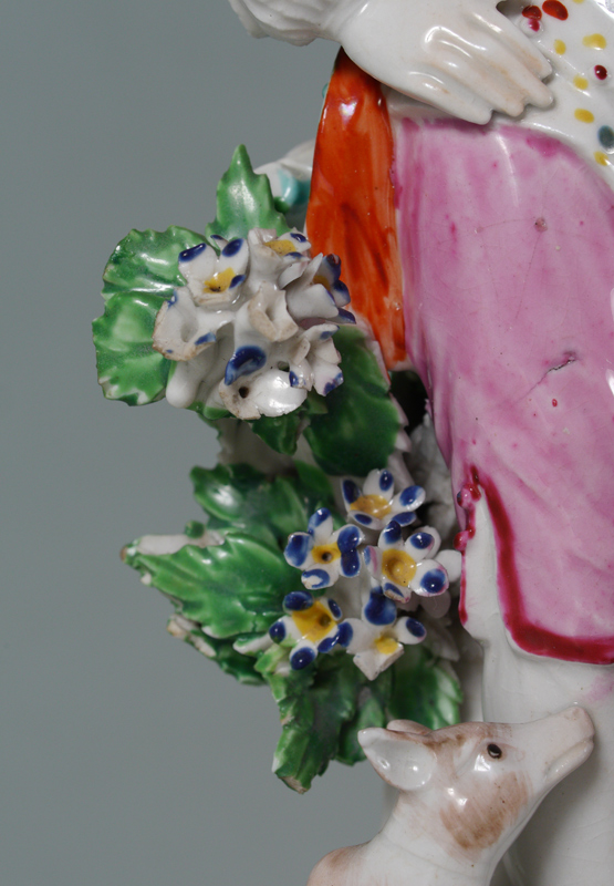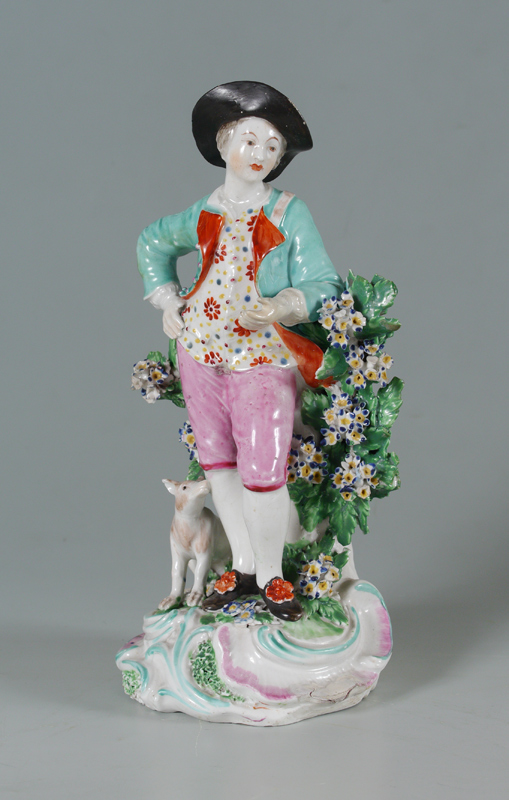 MEISSEN QUALITY PORCELAIN FIGURE: Dapper gentleman with a dog and an expulsion of flowers behind him. No visible mark, 8 1/2'' h. x 3 3/4''.