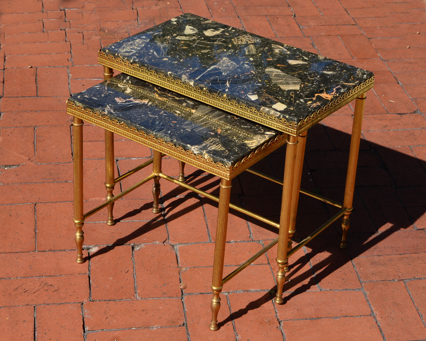 2 INSET MARBLE BRASS NESTING TABLES: Brass stands with pierced rims, inset marble top, fluted legs. Overall larger measures 17 1/4'' h. x 19 3/4'' x 12 1/4''.