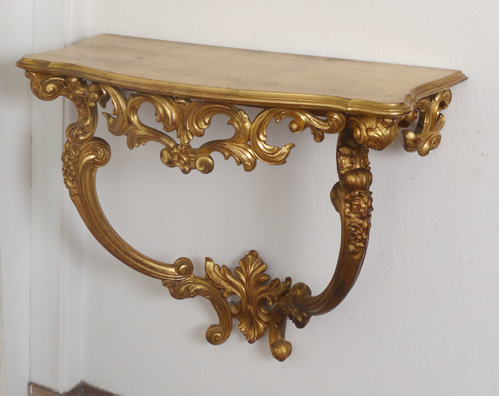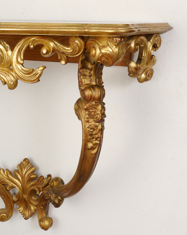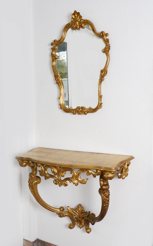 CARVED GILT WOOD FOYER SHELF & MIRROR: 20th century Belgian production, gilt wood shelf with carved foliate scroll supports, 25 1/2'' h. x 33 1/4'' x 14''. Mirror with shell & foliate motif, 29 3/4'' h. x 19'' x 2 1/2''.