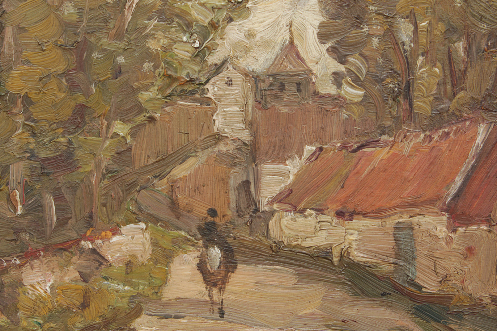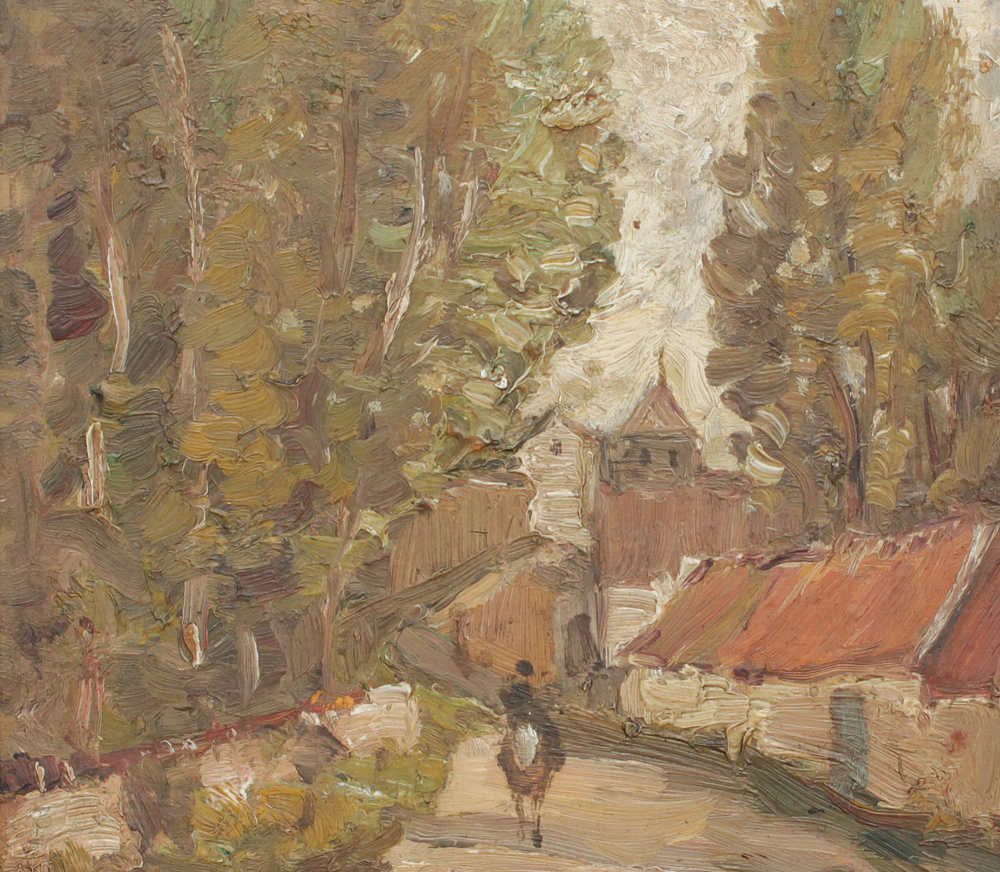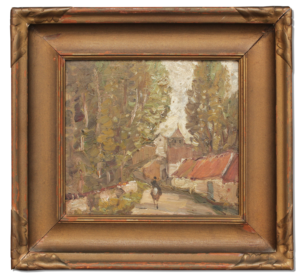 EUROPEAN IMPRESSIONIST VILLAGE LANDSCAPE PAINTING: Oil/Wood, 7 3/4'' x 8 3/4'', no visible signature, period carved and painted frame 12 1/4'' x 13 1/4''.