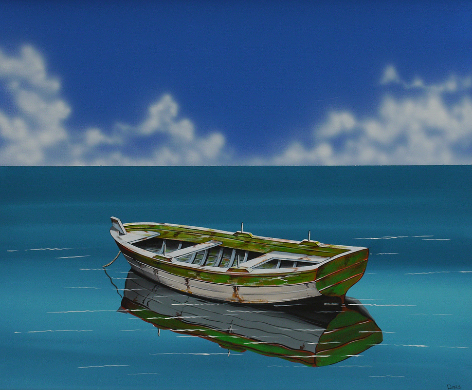DENIZ, Ilkin, (Turkish, 1961- ): Serene Ocean Scene with Dilapidated Row Boat, Oil/Canvas, sight size 19 1/2'' x 23 1/2'', signed lower right, framed 28'' x 32'', artist's information affixed verso.