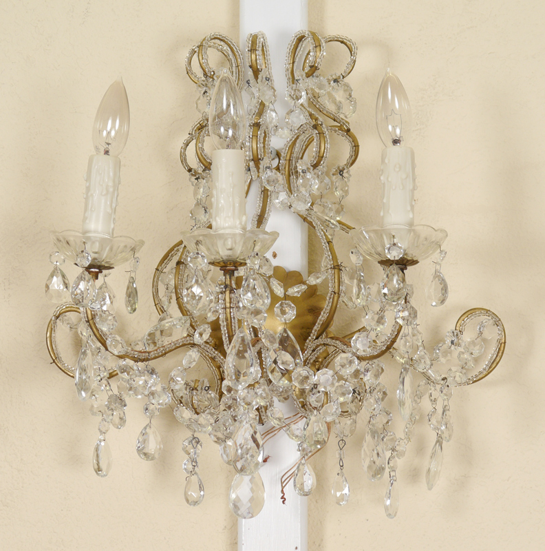 PAIR OF CRYSTAL WALL SCONCES: 3 light electric, gilt metal framed with crystal garland, swags and drop prisms. Overall measure 14'' h. x 8 3/4'' x 16''.