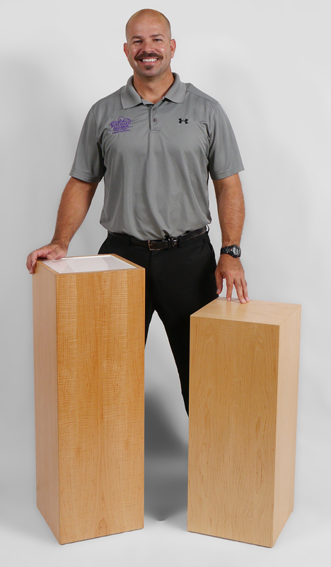 2 CUSTOM MODERN WOODEN PEDESTALS: Each with a light wood veneer, to include 1) Illuminated white plastic inset top, 36 1/4'' h. x 12''. 2) Smaller standard pedestal, 30 1/2'' h. x 12''.