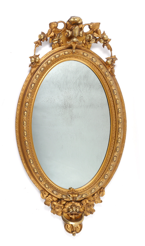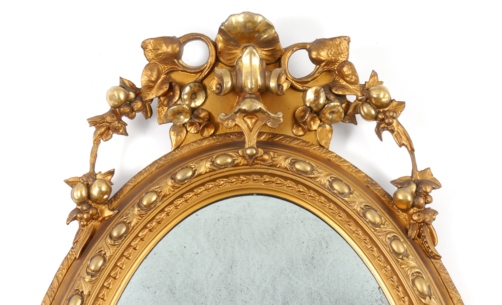 LARGE CARVED GILT WOOD WALL MIRROR: Rococo style gilt wood mirror, frame with vines and fruit finials, outer rim with egg and foliate motif. Overall measures 57'' h. x 28'' x 7''.