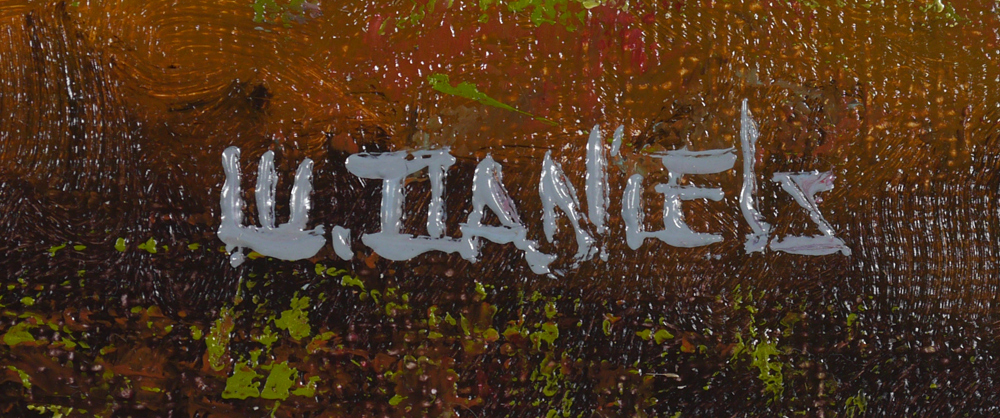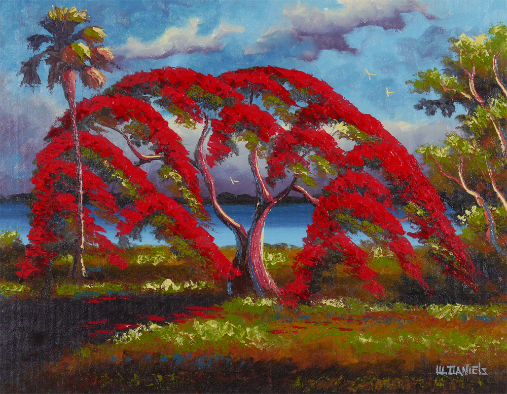 DANIELS, Willie, (American, 20th Century): Florida Highwaymen Royal Poinciana at Shoreline of the Indian River, Oil/Board, signed lower right, 14'' x 18'', painted wood frame 15 3/4'' x 19 3/4''.