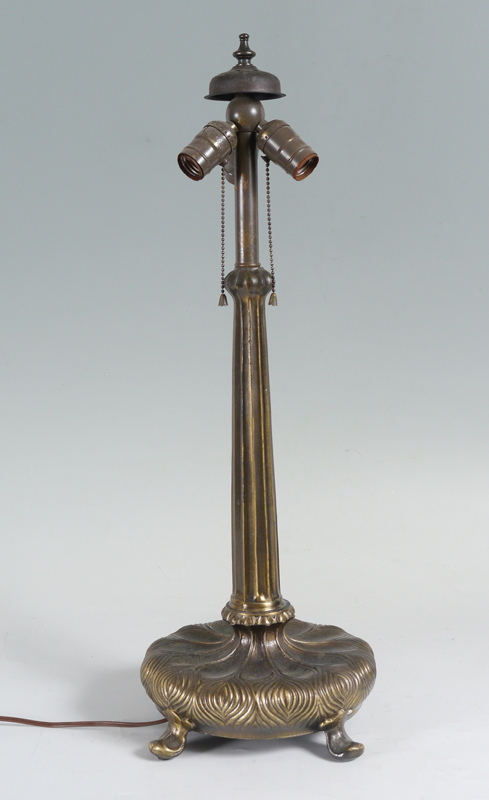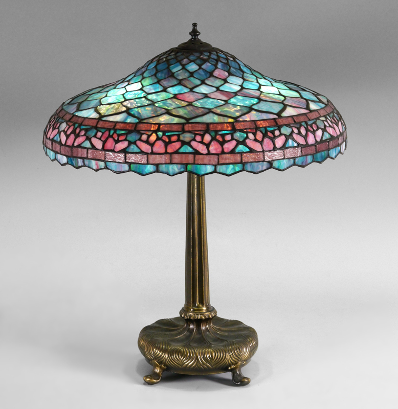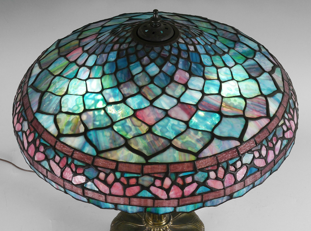 CONTEMPORARY LEADED GLASS LAMP: Patinated metal base on 4 feet, 3 socket fixture, 27'' h., illegible mark on base. Leaded glass shade with pinks, blues and whites, 7 1/2'' h. x 22 1/2'' diameter.
