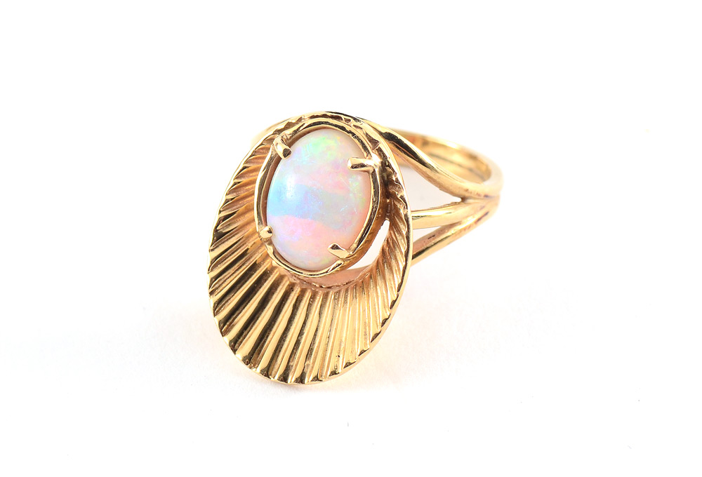 RETRO OPAL RING: 14K yellow gold fan ring with a solitaire 1.70 Ct cabochon opal, 10 mm. oval. Size 5.75. Weight 5.7 grams.