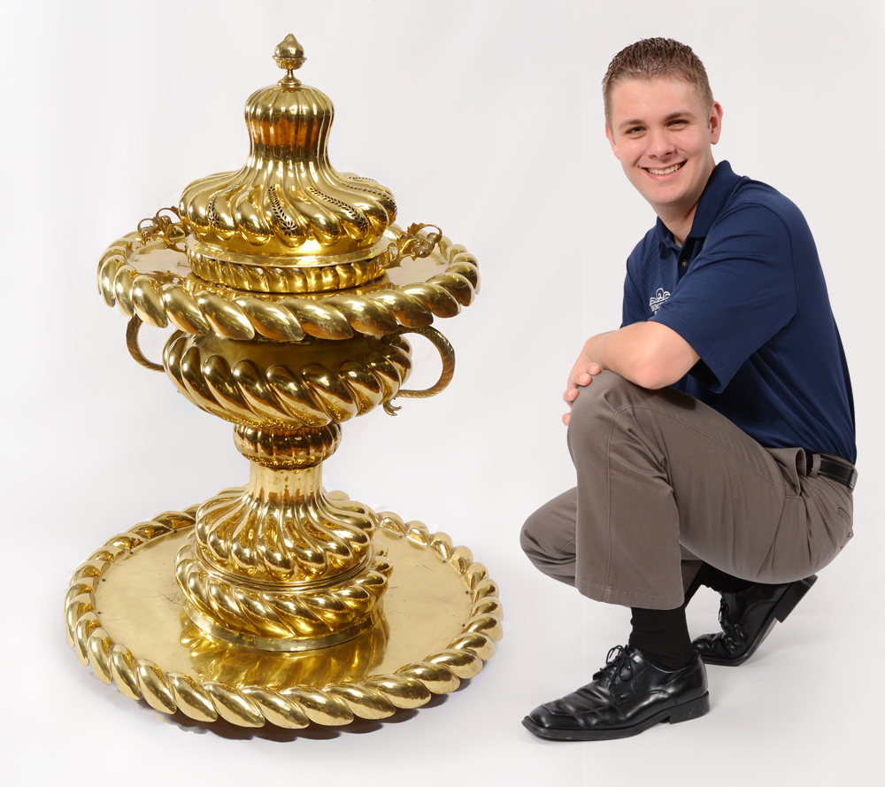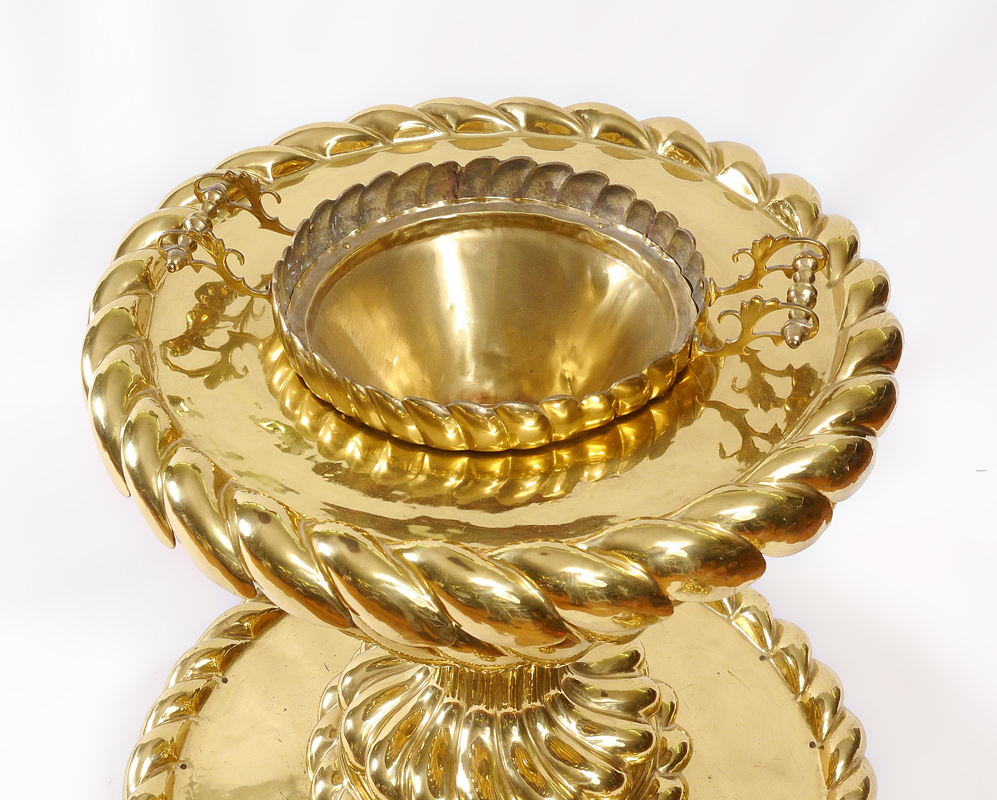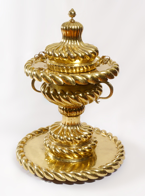 LARGE POLISHED BRASS TURKISH BRAZIER: Pierced lid, rope twist design on rims of base. Overall measures 43'' h. x 33'' dia.