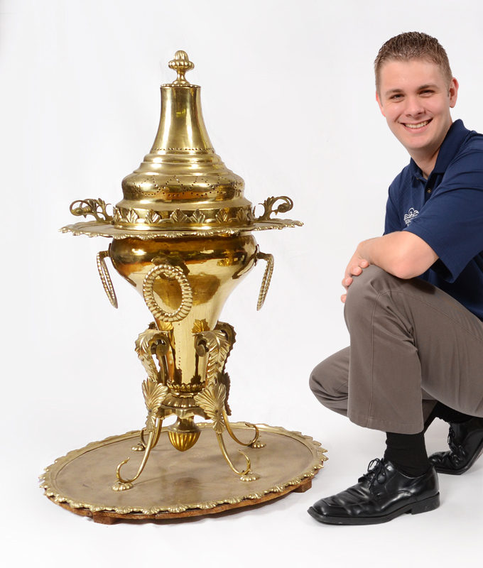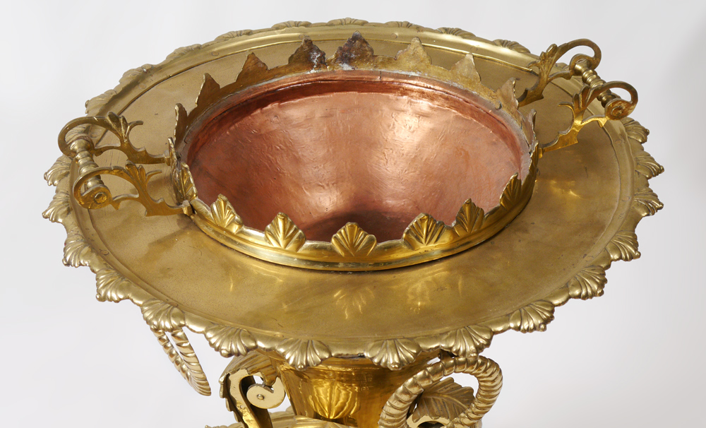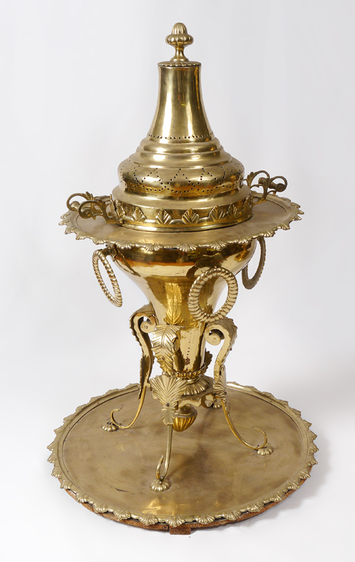 POLISHED BRASS TURKISH BRAZIER: Pierced lid, embossed rims on top an bottom trays, body with embossed decoration and removable from base tray. Overall measures 41'' h. x 27''.
