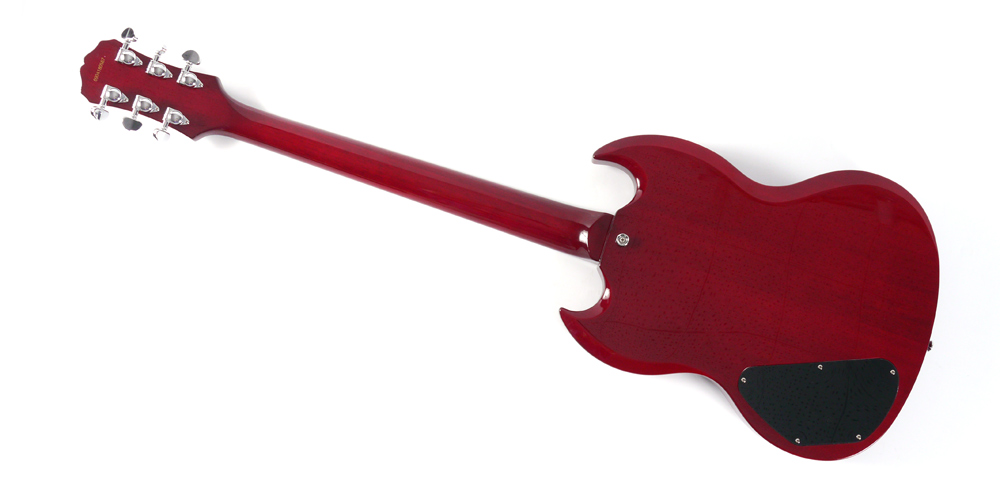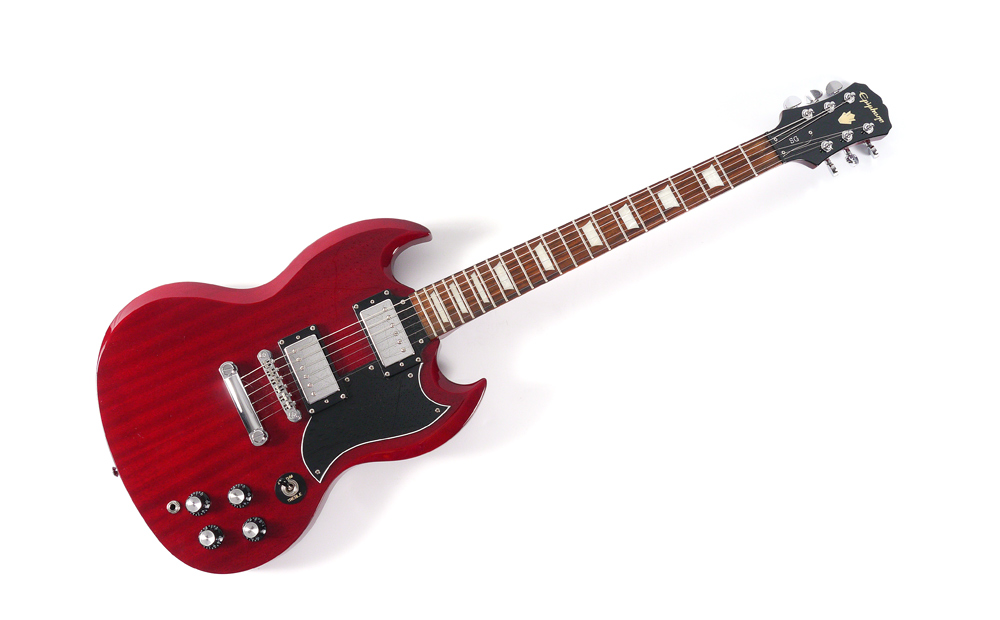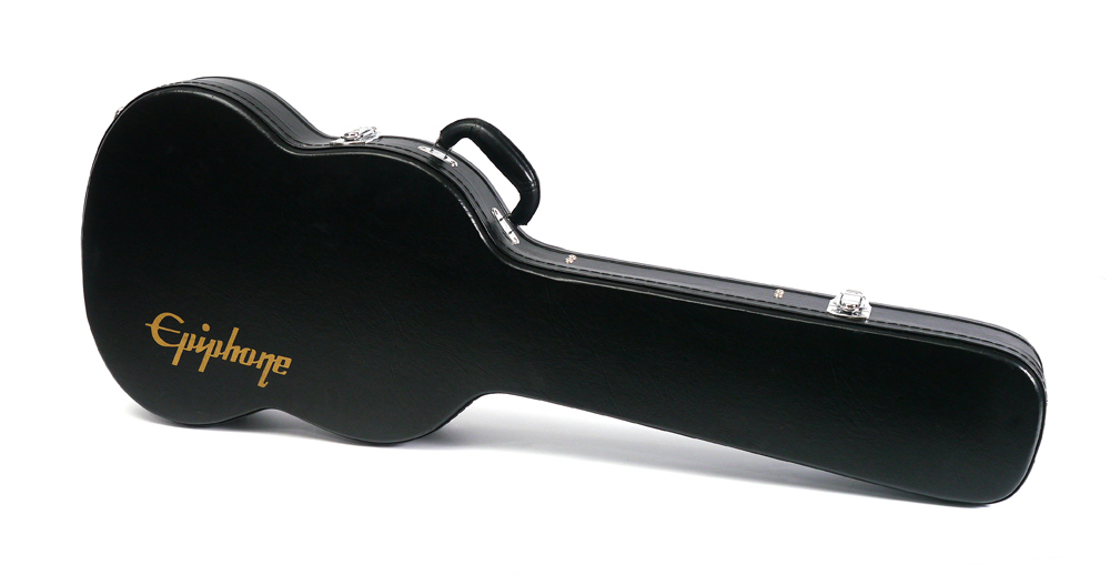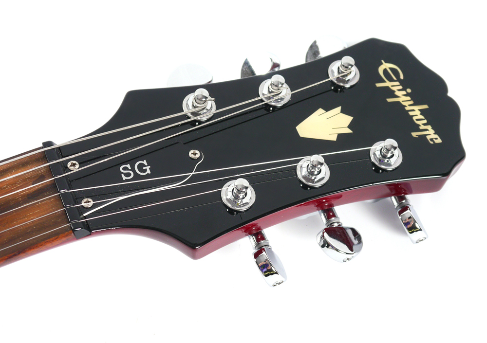 EPIPHONE SG GUITAR & CASE: Later production, red lacquer body, mother of pearl accents on neck, serial number 09044180587, overall 40 1/2'' long. Overall pristine condition. Sold with a Epiphone hard case, 4 1/2'' h. x 43 1/4'' x 16''.