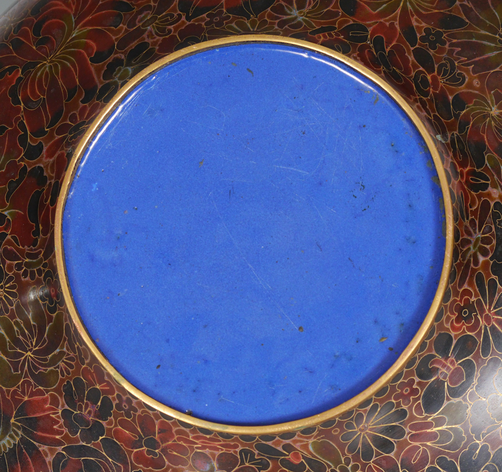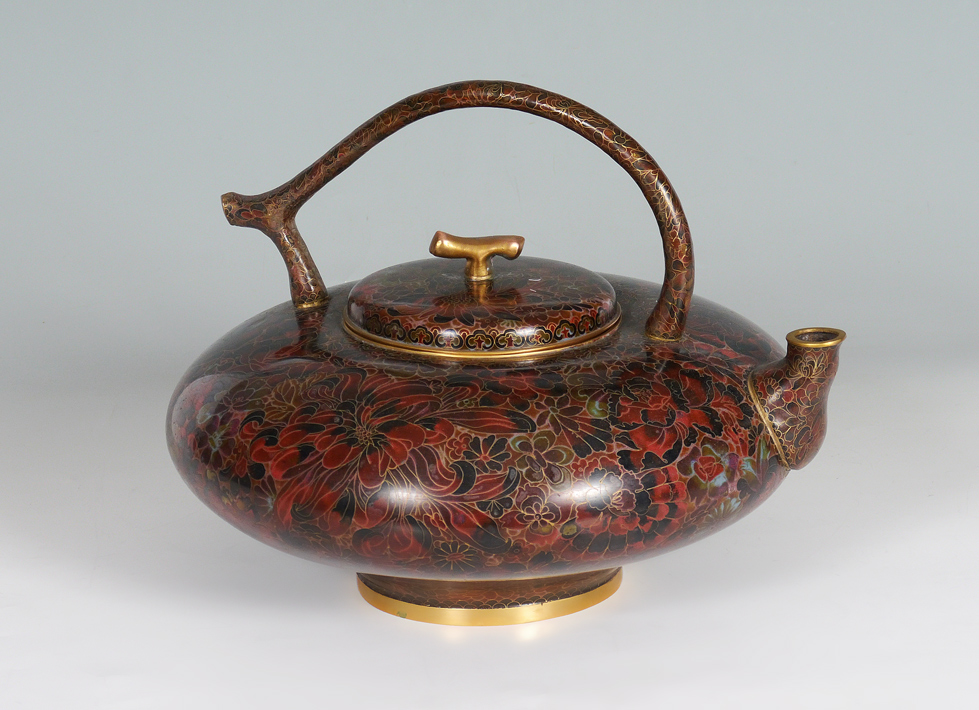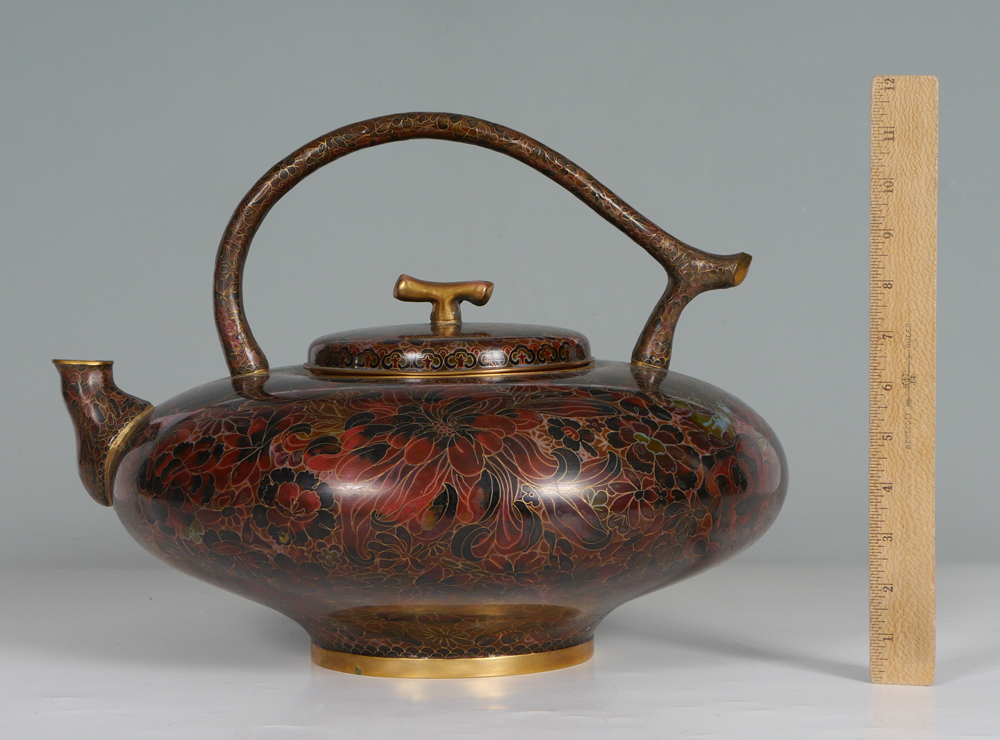 CHINESE CLOISONNE TEA POT: Oversized hot water kettle, dark toned floral motif on brass, overall measures 12'' h. x 16''.