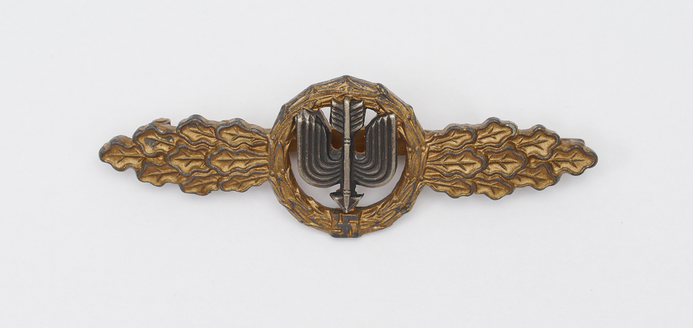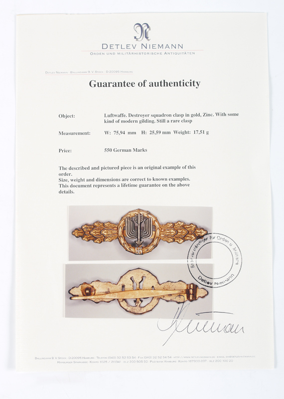 WWII GERMAN LUFTWAFFE DESTROYER / DAY FIGHER CLASP: Zinc with gold gilding, no visible makers mark, 3'' long. Sold with a Detlev Niemann Guarantee of Authenticity.
