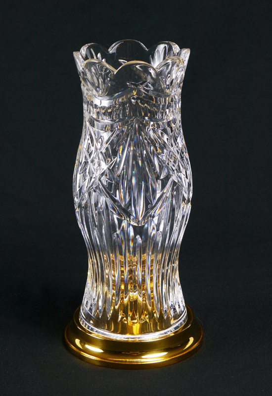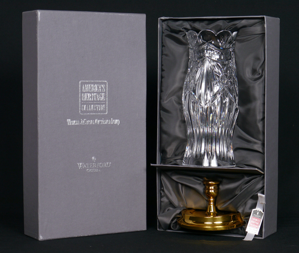 WATERFORD AMERICAN HERITAGE THOMAS JEFFERSON HURRICANE LAMP: Lamp overall measures 15'' tall. Heavy brass candle stand with crystal hurricane shade. Sold in the box, 18'' x 6 1/4'' x 10''.