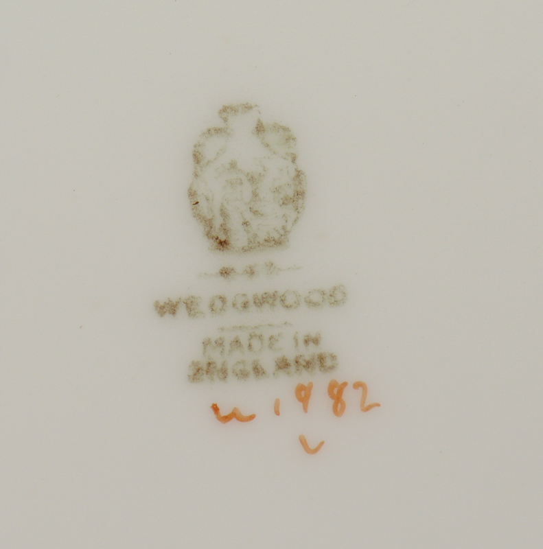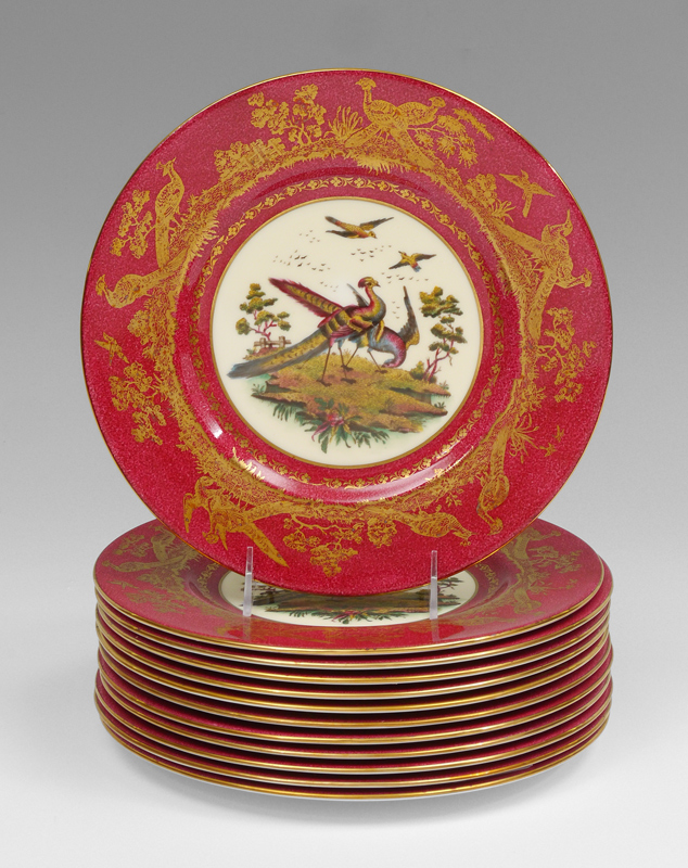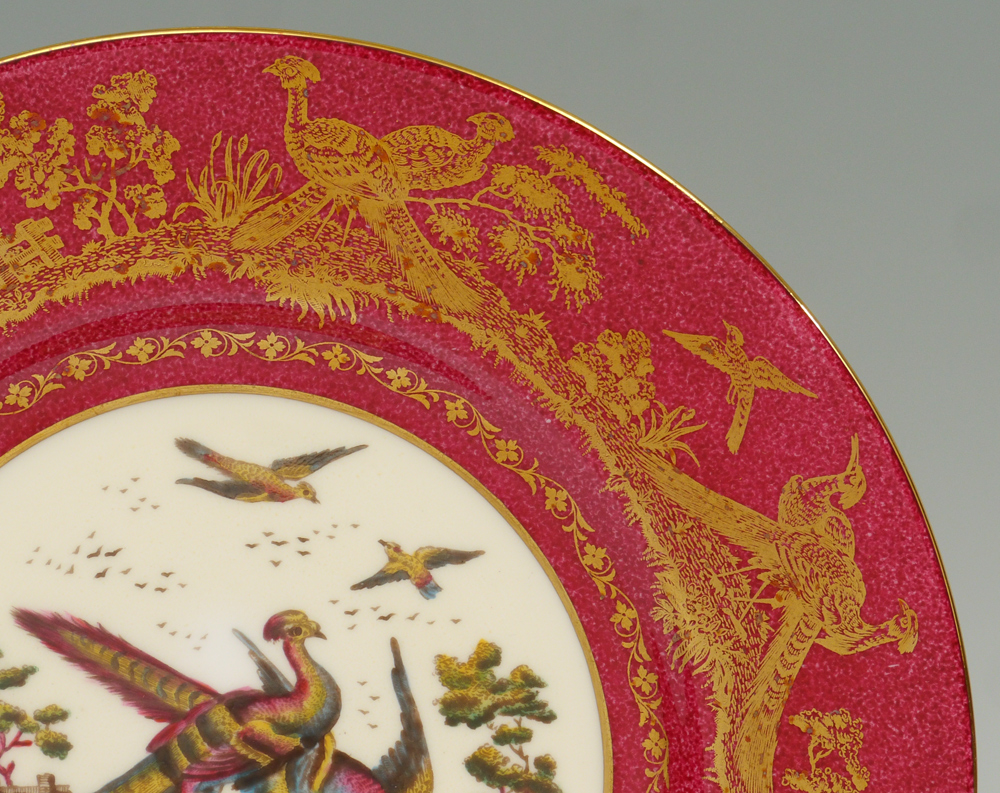 12 WEDGWOOD PHOENIX SERVICE PLATES: Ornate fuscia trim with gilt bird of paradise motif, center with bird of paradise in field and flight. 10 5/8'' dia.