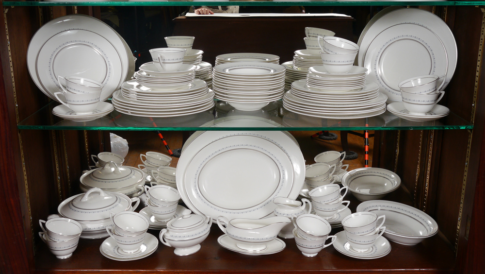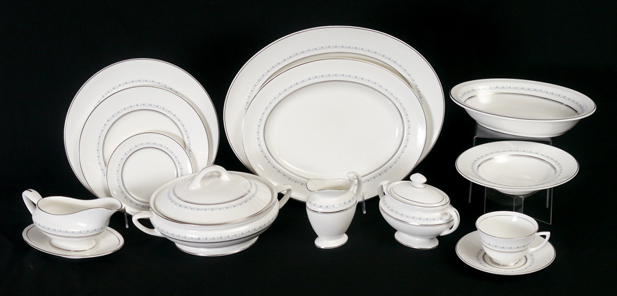 ROYAL DOULTON ''TIARA'' FINE CHINA SERVICE: Platinum rings with blue/gray vine, approx. 91 pieces to include 12 dinner plates (10 5/8''), 12 luncheon plates (9''), 13 bread plates, 12 soup bowls, 19 cups, 16 saucers, covered vegetable, open vegetable, cream pitcher, sugar, and 2 platters (12 3/4'' & 15'').
